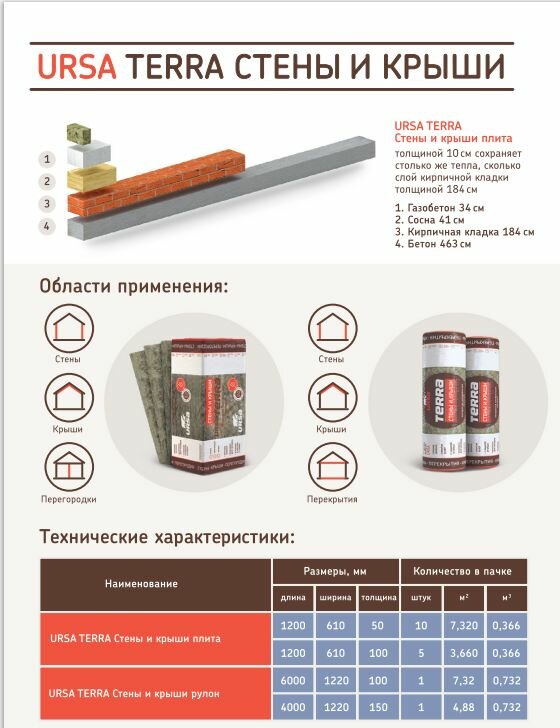 Минеральный утеплитель для стен и крыши URSA TERRA 36 PN Стены и крыша 50 мм 76,2 м2. информация: