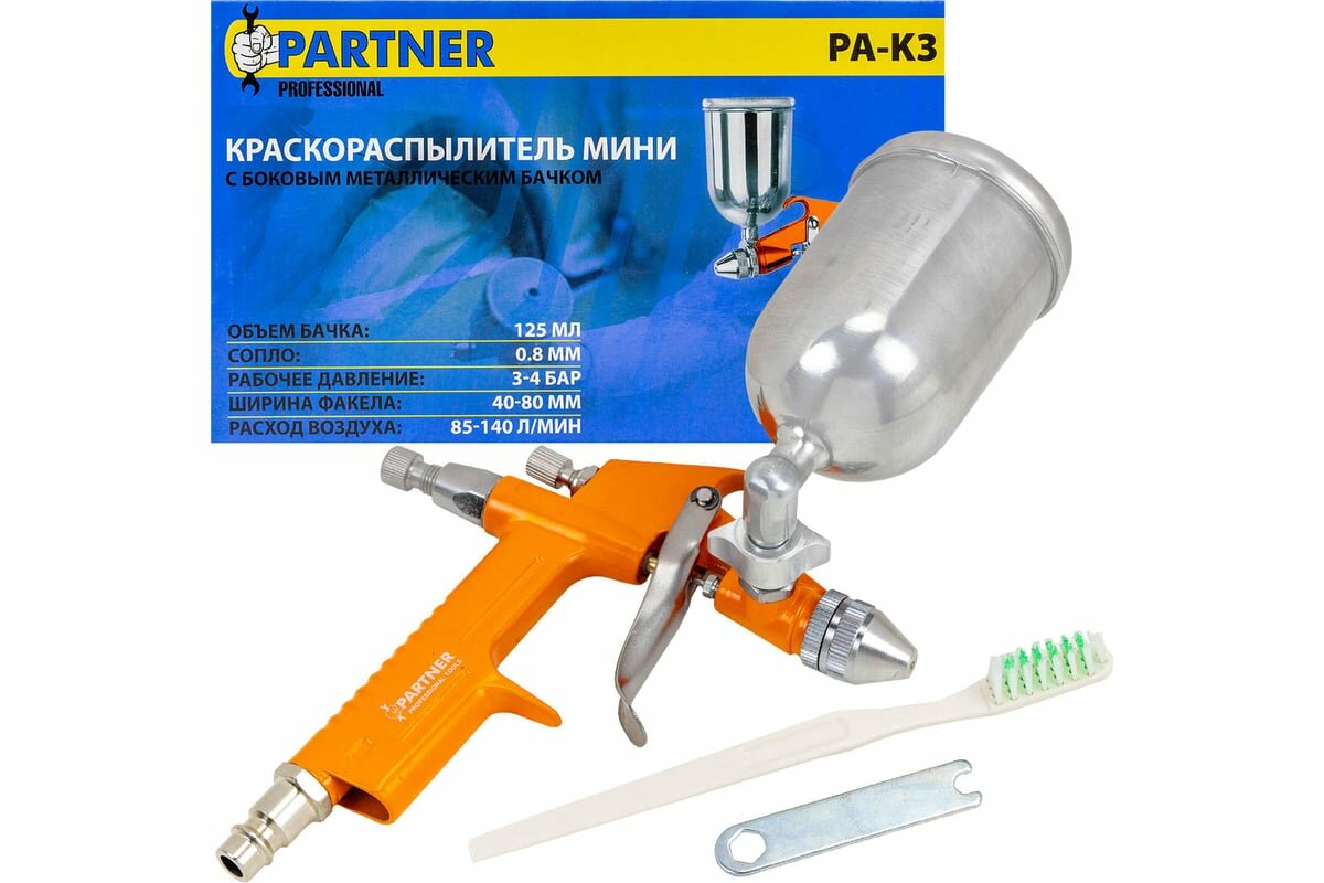 Отзывы на Partner Краскораспылитель мини с боковым метал. бачком (125мл, 0.8мм, 2.0bar, 50-100 л/мин, присоед. резьба 1/4") PA-K3(28396)