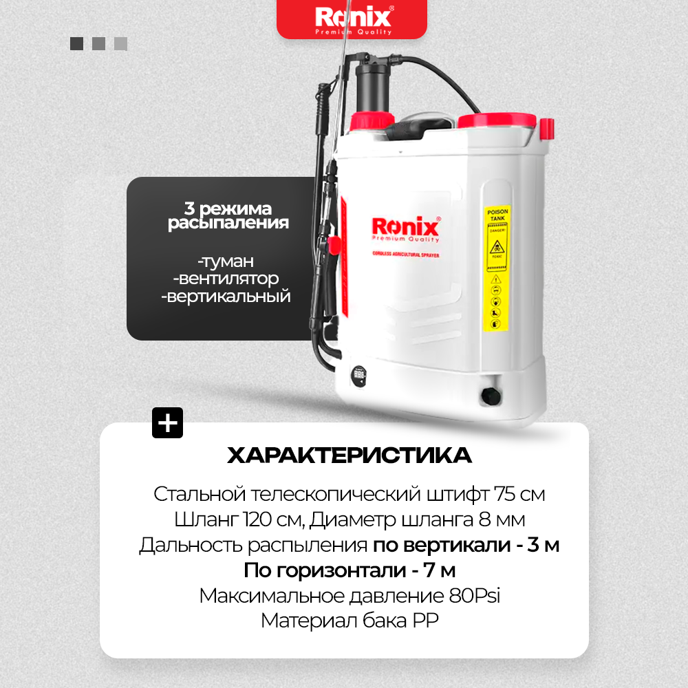 Отзывы на Аккумуляторный опрыскиватель 2 в 1 Ronix 20 литров ранцевый 12 В/8 Ач расход 3,1 Л/мин длина шланга 120см