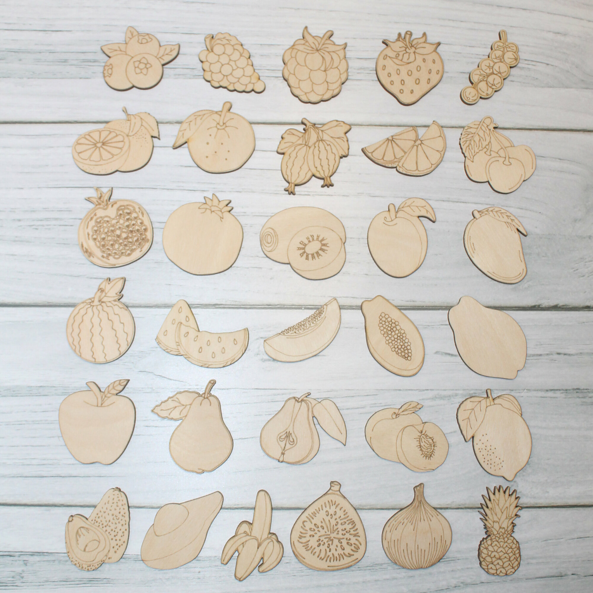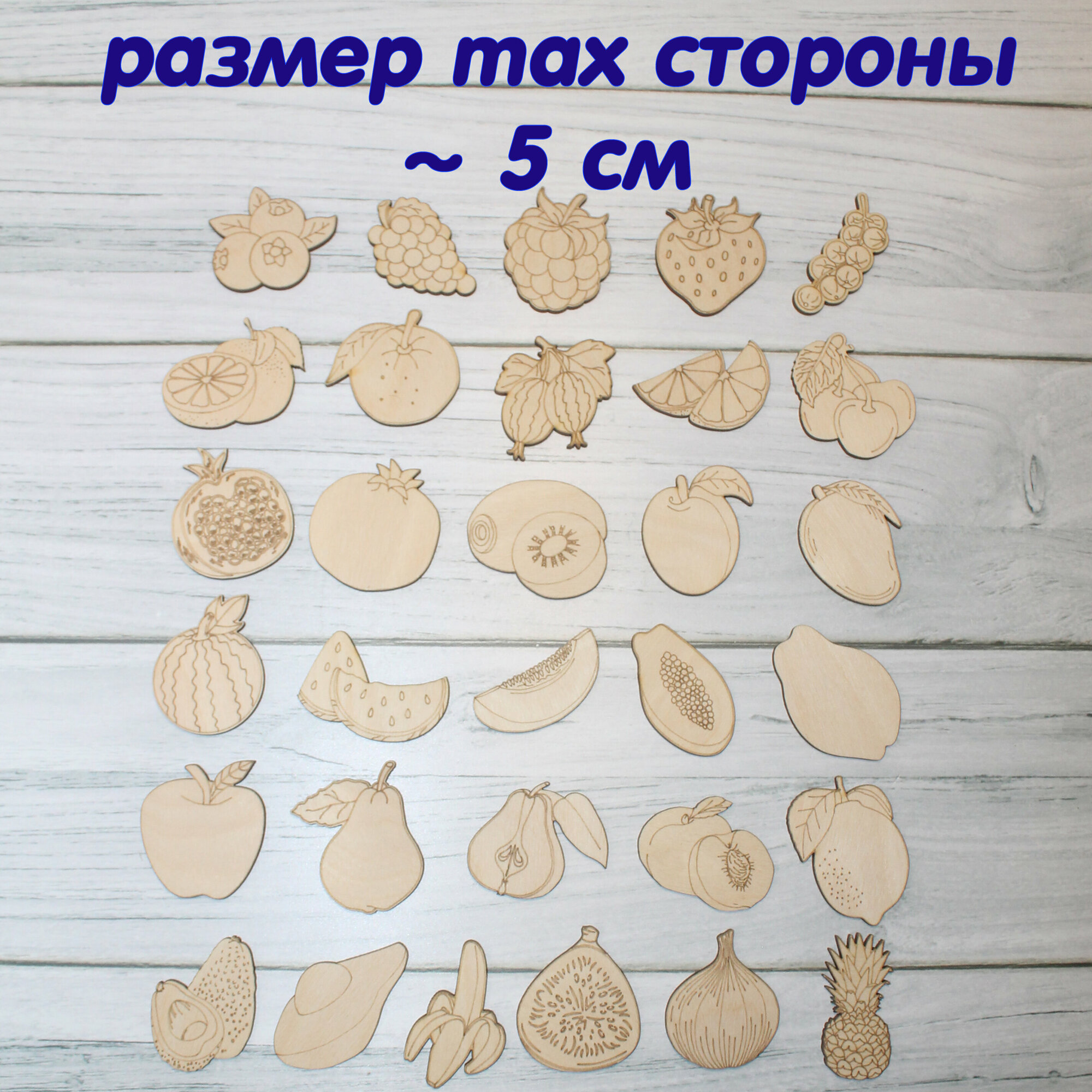 Деревянные заготовки для творчества, для значков, магнитов, брошей. Набор "Фрукты, ягоды" из 30 шт информация: