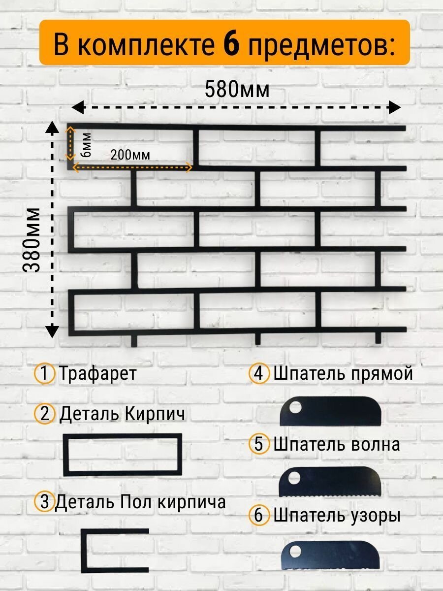 | Комплектация | 6 предметов: 1 - трафарет основной горизонтальный; 2 - трафарет целый кирпич; 3 - шпатель для декора волна; 4 - шпатель рельефный; 5 - выравниватель для штукатурки и цемента; 6 - трафарет половина кирпича. |