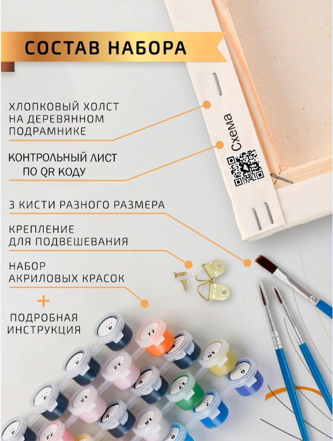 | Комплектация | -Холст на подрамнике -набор акриловых красок -3 кисти разного размера -настенное крепление -салфетки -подробная инструкция -схема картины в электронном виде по QR-коду -авторская коробка (подставка-мольберт и стаканчик) |