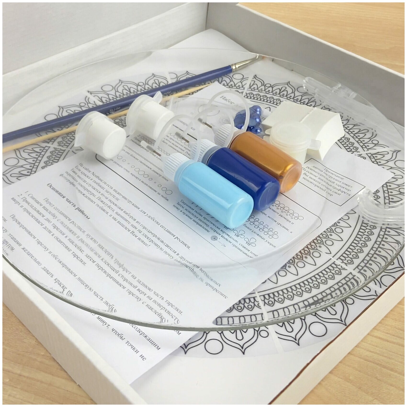 | Подробная комплектация | О товаре: Набор для точечной росписи тарелки- это возможность создать шедевр своими руками, не имея художественных навыков. Достаточно следовать простой и удобной инструкции, и готовая работа сможет украсить интерьер Вашего дома. Состав: 1. Подробная инструкция; 2. Наклейка с изображением узора; 3. Стеклянная тарелка диаметром 250 мм.; 4. Акриловые контуры по стеклу и керамике 3 шт.; 5. Краска по стеклу для создания фона 2 шт.; 6. Губка для нанесения фона; 7. Бусины 14 шт.; 8. Клей; 9. Подставка для декоративных тарелок; 10.Кисть |