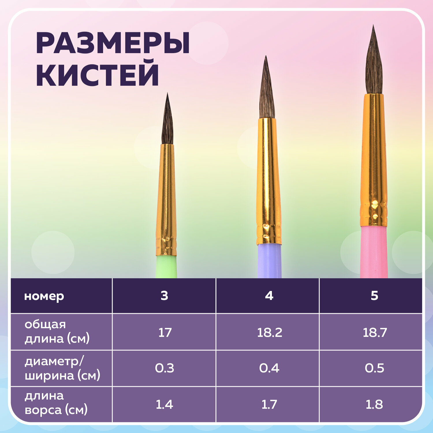 Кисти для рисования в школу набор 3 штуки, кисточки круглые № 3 4 5, пони, Brauberg Kids, 201074 информация: