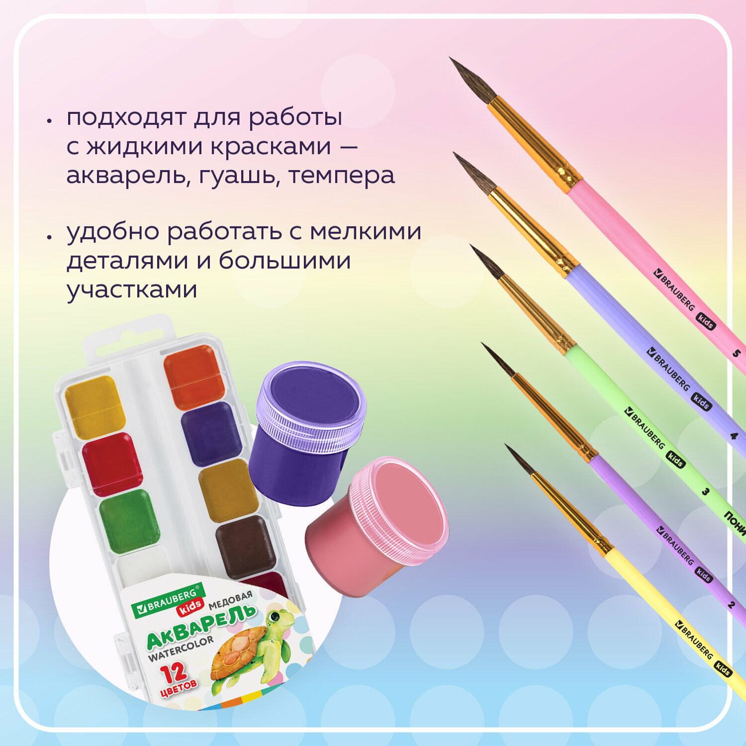 Кисти для рисования в школу набор 5 штук, кисточки круглые № 1 2 3 4 5, пони, Brauberg Kids, 201072 информация: