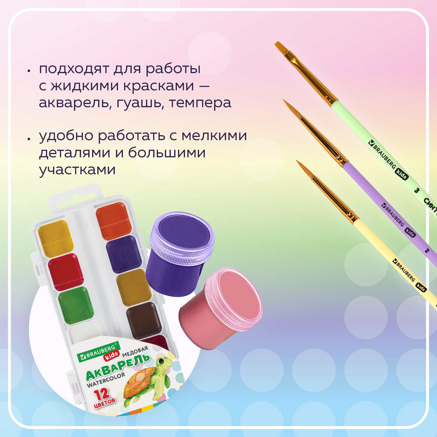Кисти для рисования в школу набор 3 штуки, кисточки круглые № 1, 2, плоские № 3, синтетика, Brauberg Kids, 201078 информация: