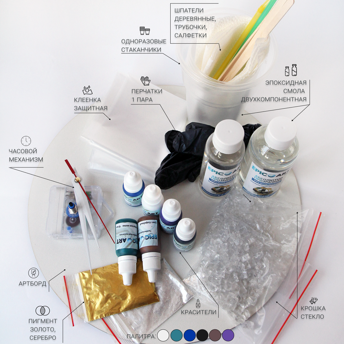 | Комплектация | Комплект смолы; Артборд 1 шт; пигмент золото 1 шт, серебро 1шт; краситель 6 шт Деревянные шпатели; коктейльные трубочки; Одноразовые стаканчики; Салфетки; Клиентка для защиты стола; Видео инструкция; Общая инструкция; Перчатки 1 пара; Стеклянная крошка 2 размера; Часовой механизм; Комплект стрелок. |
