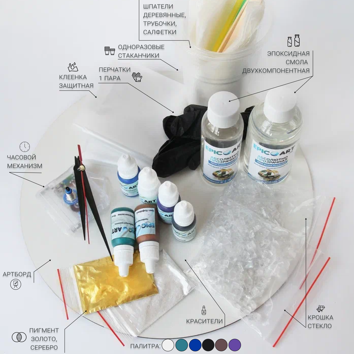 Комплектация | Комплект смолы; Артборд 1 шт; пигмент золото 1 шт, серебро 1шт; краситель 6 шт Деревянные шпатели; коктейльные трубочки; Одноразовые стаканчики; Салфетки; Клиентка для защиты стола; Видео инструкция; Общая инструкция; Перчатки 1 пара; Стеклянная крошка 2 размера; Часовой механизм; Комплект стрелок. |