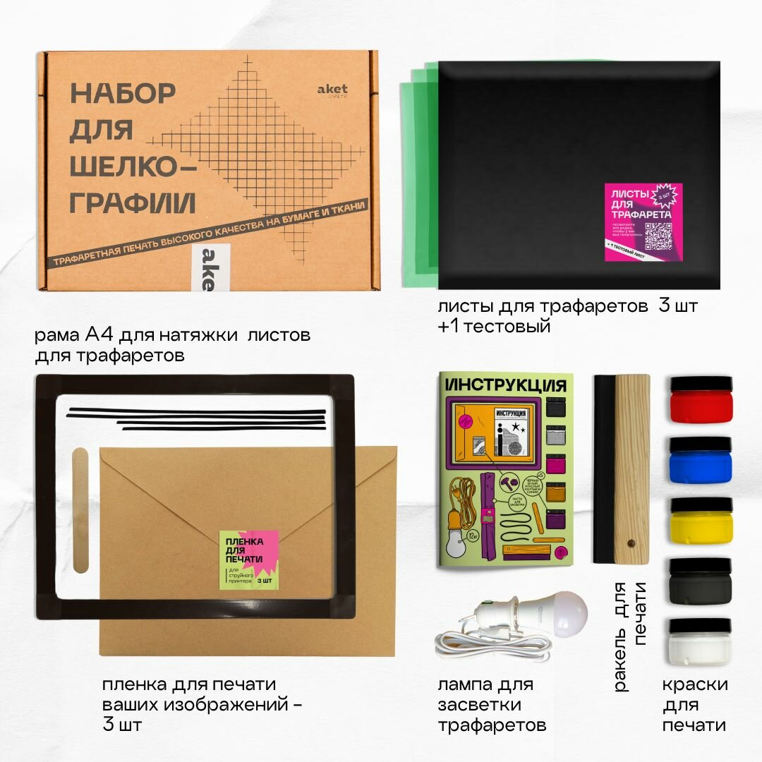 | Комплектация | рама многоразовая размера M (печатная площадь 18 х 27 см) листы для трафарета, которые натягиваются на раму (сетка с нанесенной эмульсией) - 3 шт + 1 тестовый лист резиновый шнур для натяжки листов на раму водная экологичная краска - 100 г каждого цвета (можно печатать на одежде и стирать в машинке) ракель (резиновый шпатель для печати) пленка для печати на струйном принтере - 3 шт лопатка для краски, лопатка для натяжки сетки инструкция по использованию коробка, которая превращается в засветочную камеру лампа для для засветки, которую нужно просто установить на коробку и вставить в розетку крепления для коробки |