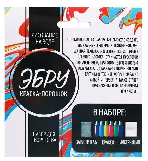 | Комплектация | Набор для рисования "Краска + загуститель для Эбру" |