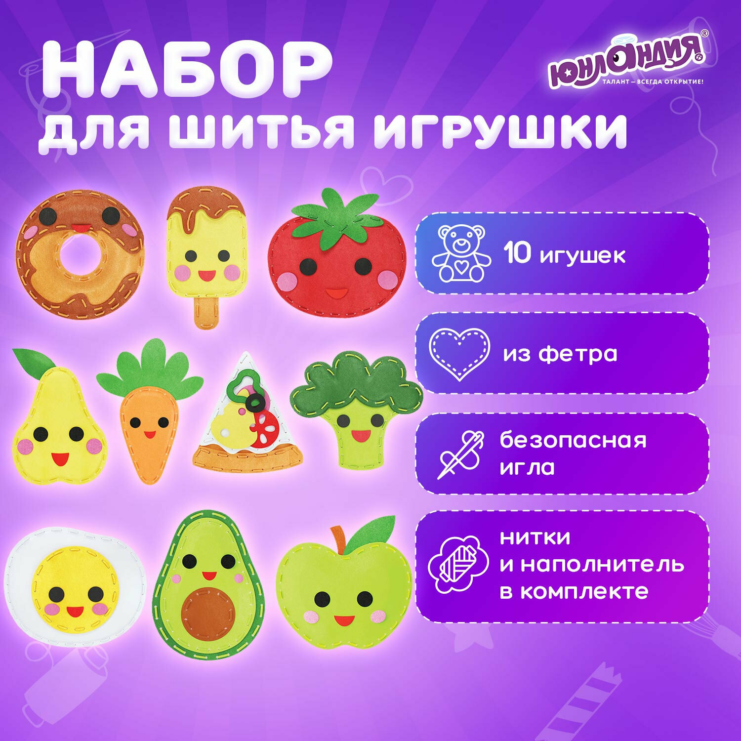 Набор для шитья игрушки куклы из фетра детский для девочек, подарок для творчества и рукоделия 10 игрушек, швейный набор, Юнландия Вкусняшки, 664734 316 ₽