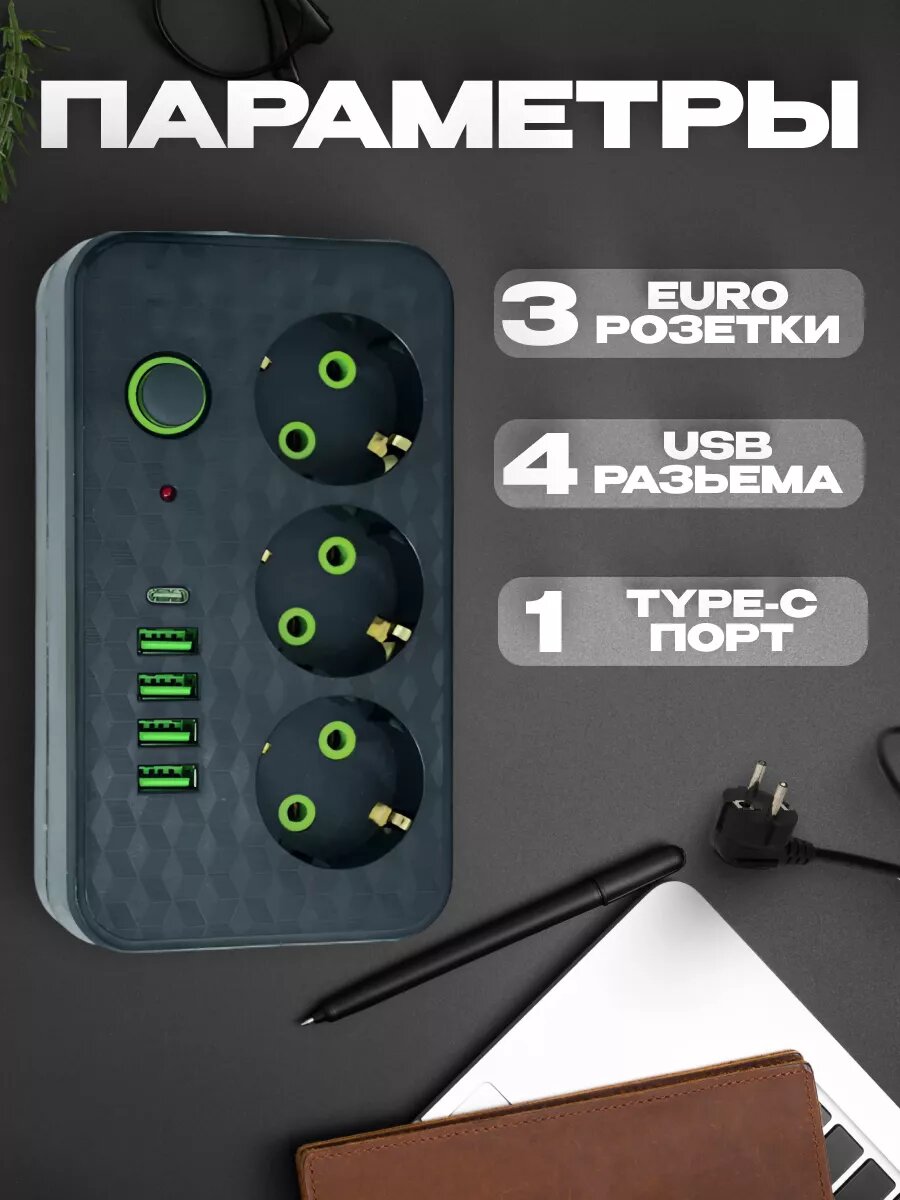 Сетевой фильтр удлинитель 3 метра USB и Type C информация: