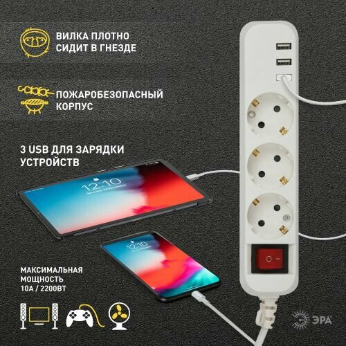Удлинитель электрический 3 розетки, 3 USB, 1,5м 10А ЭРА с заземлением, с выключателем, белы 533 ₽