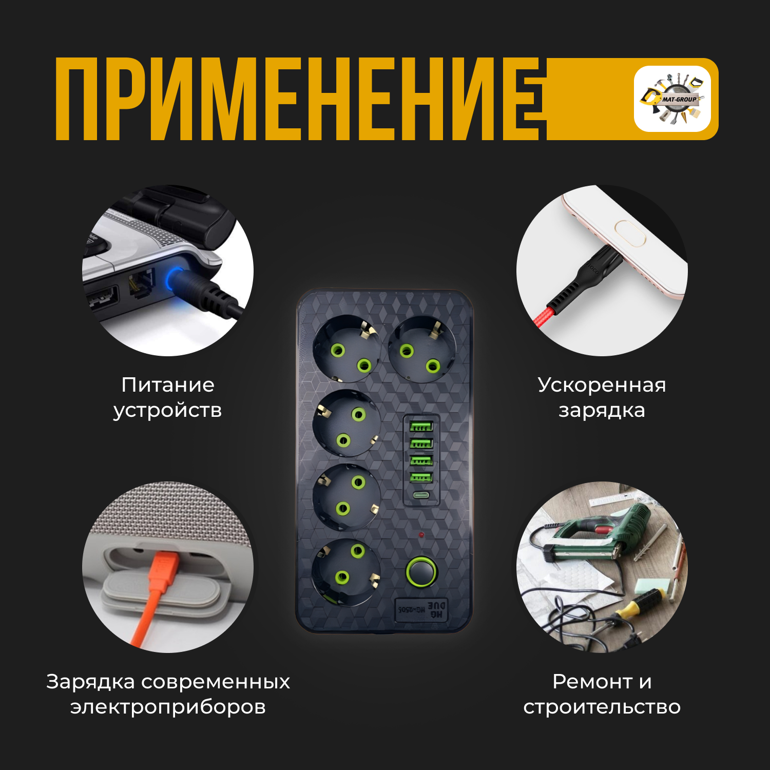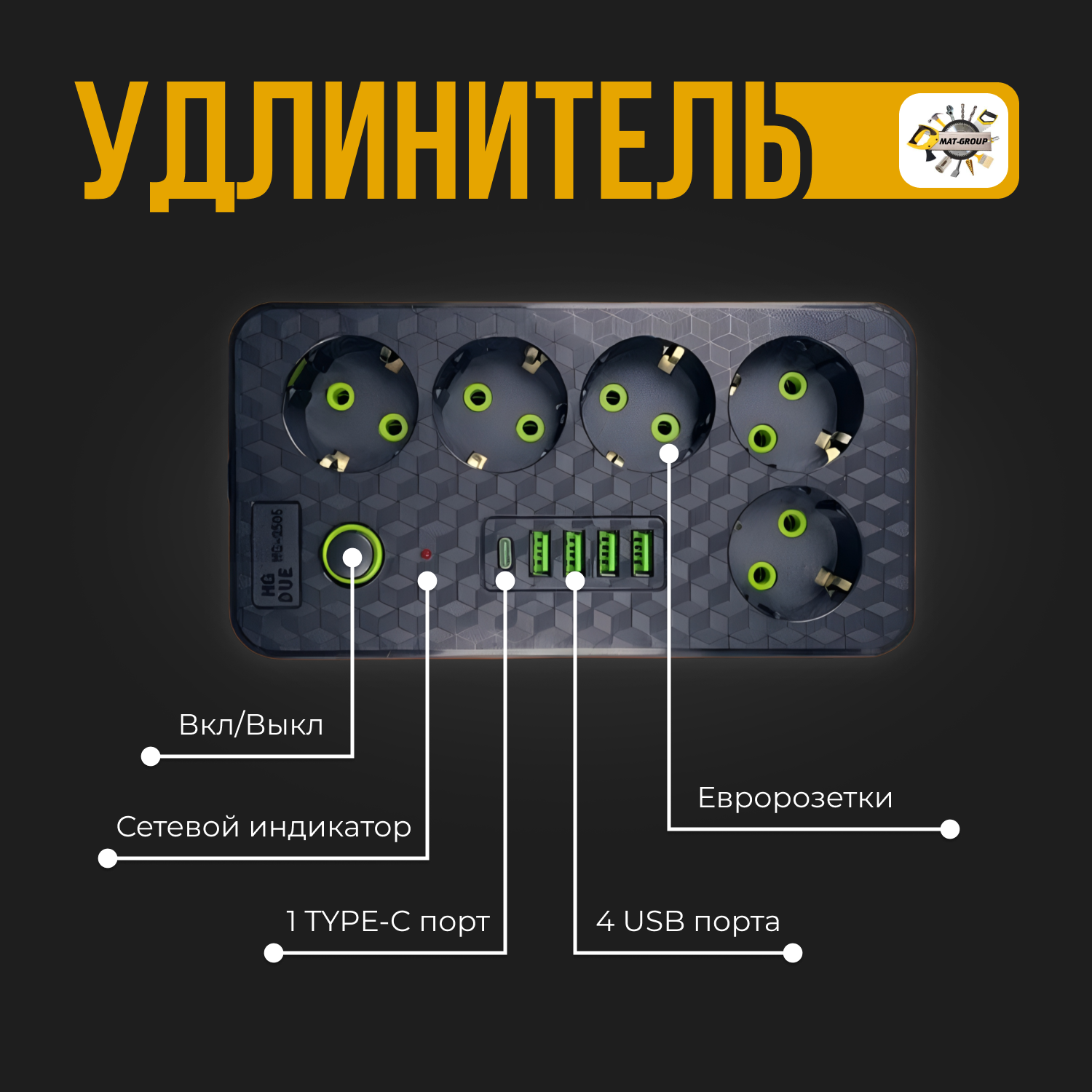 | Дополнительная информация | Сетевой фильтр с 3 гнездами и 4 USB 1 Type-C |
