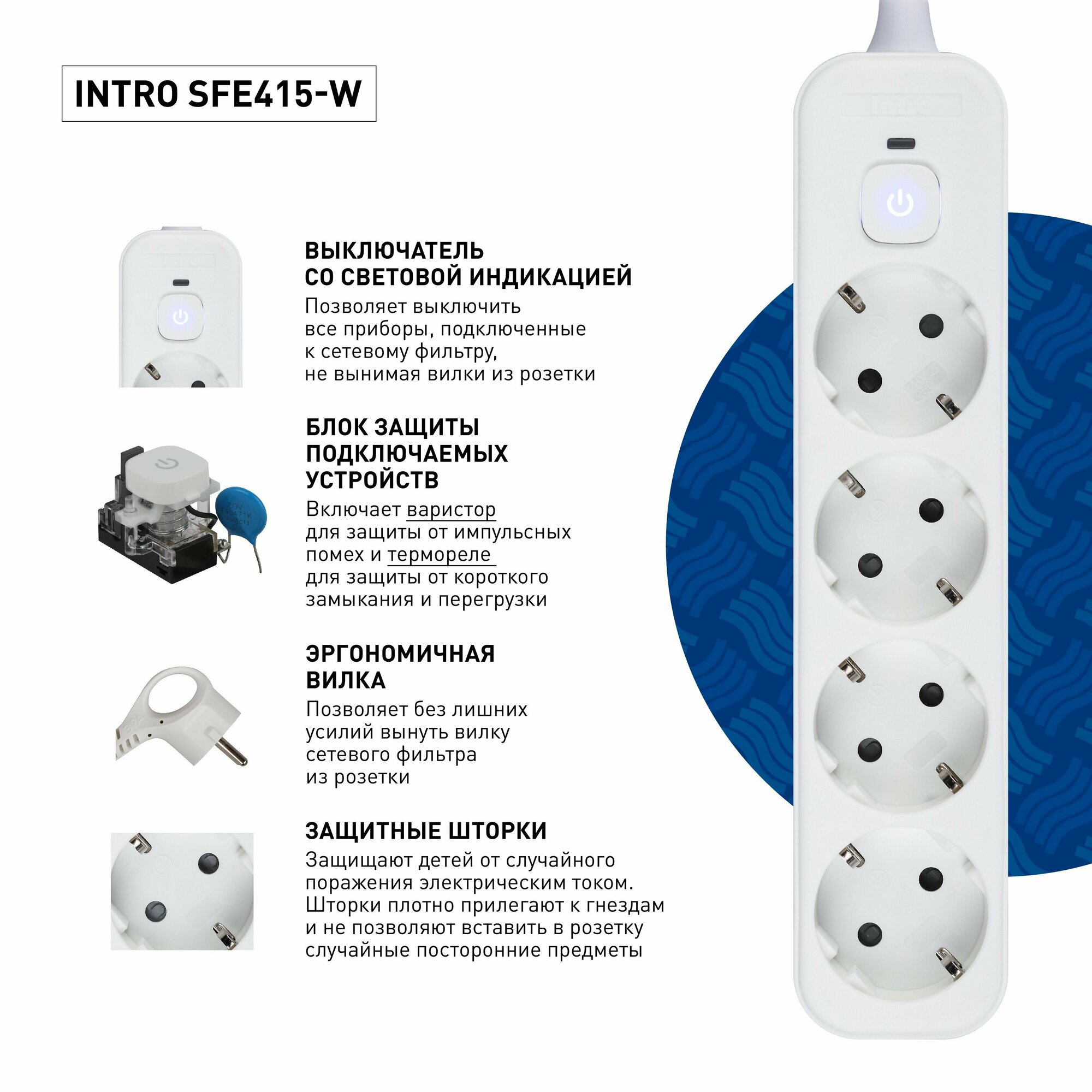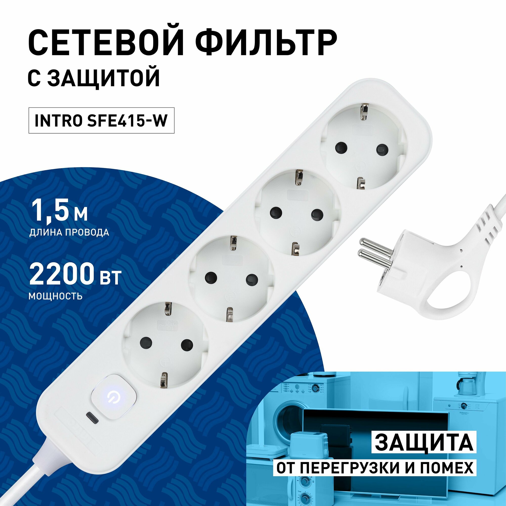10 цен на Сетевой фильтр Intro SFE415-W с базовой защитой с заземлением с выключателем 4 розетки 1,5м 10А белый