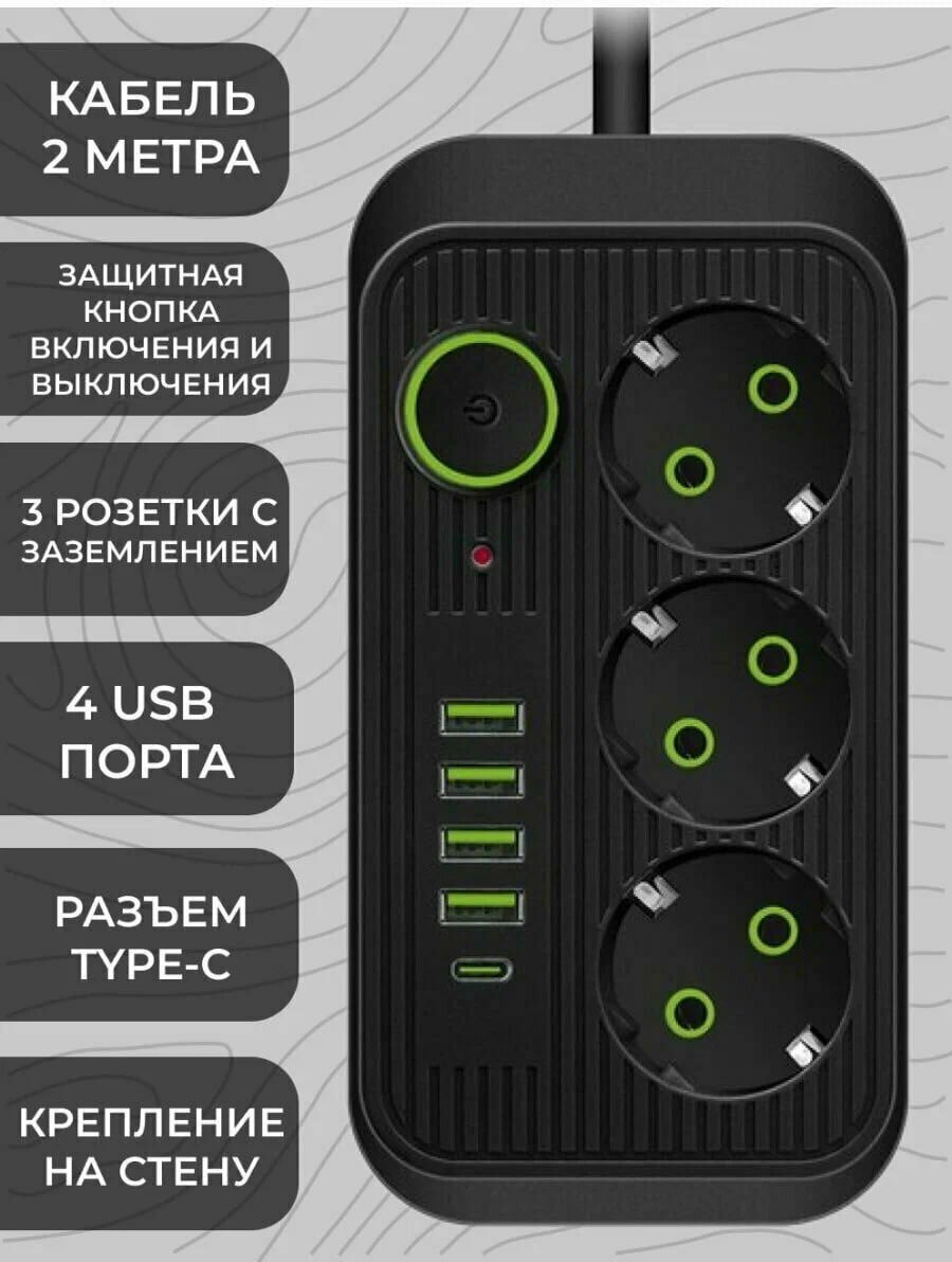 Отзывы на Сетевой фильтр Удлинитель с 4 USB-портами, 1 Type-C черный от GadFamily_Shop