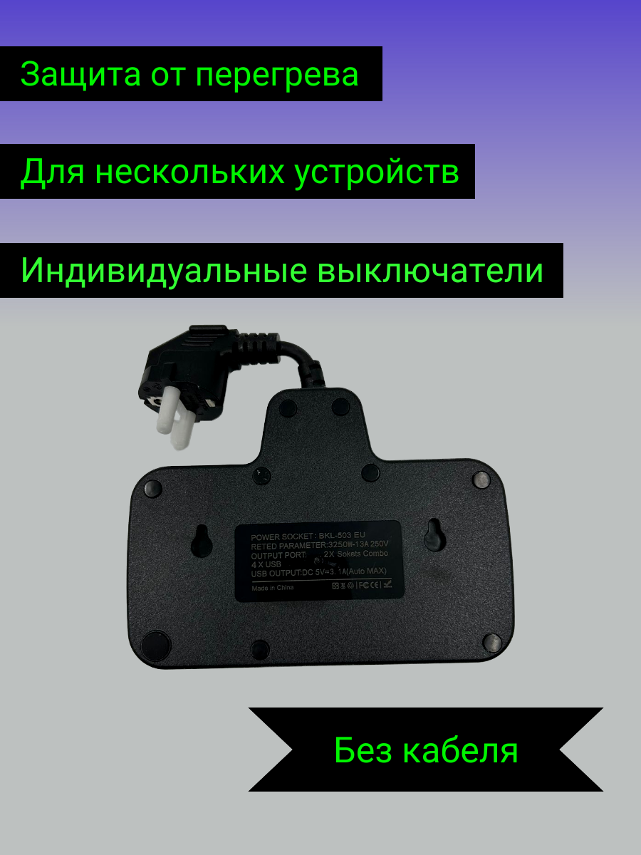 Сетевой фильтр Удлинитель с 4 USB-портами, 1 Type-C черный от GadFamily_Shop 750 ₽