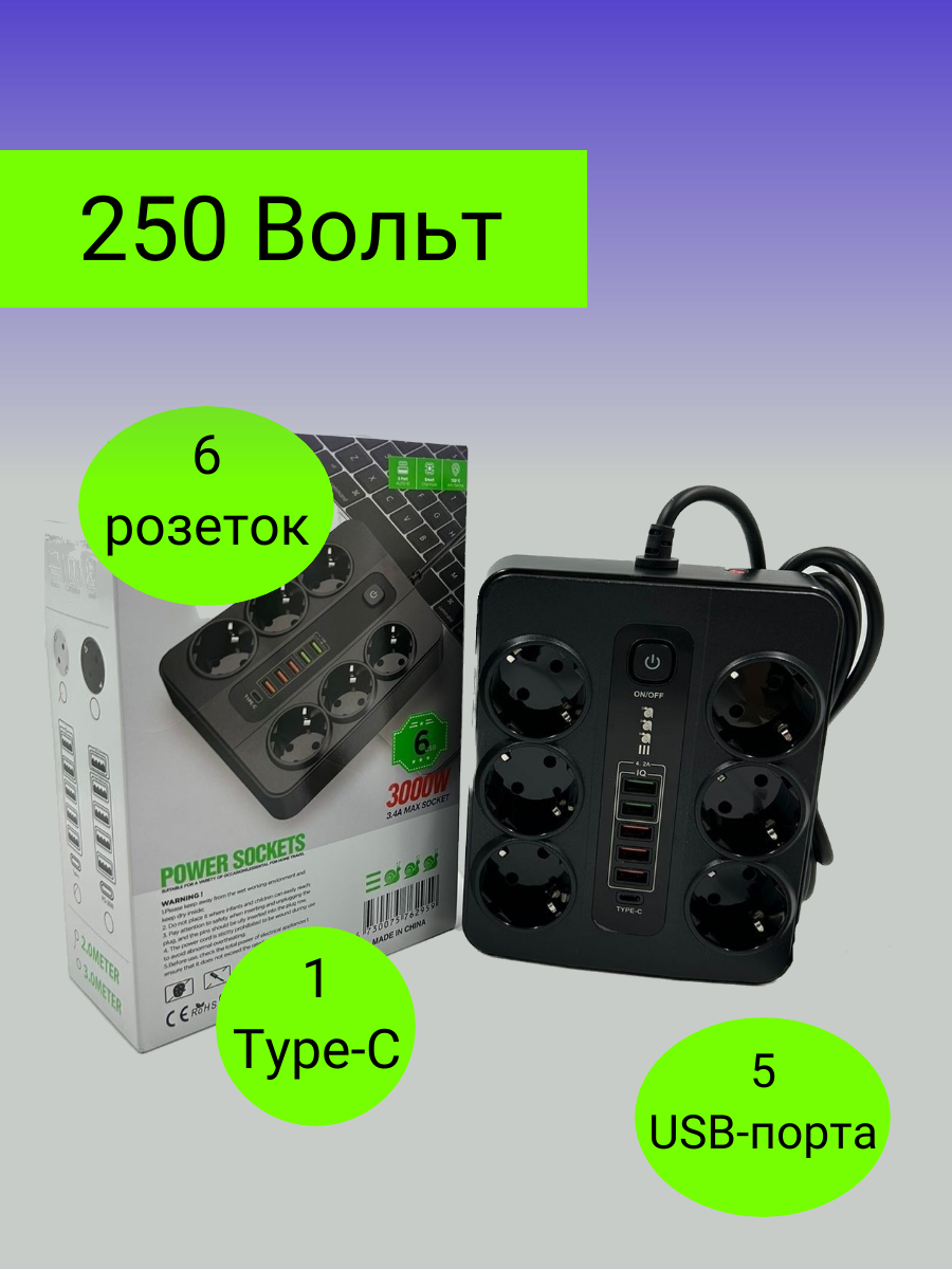 Сетевой удлинитель 6 розеток, 5 USB, 1 Type-C черный от GadFamily_Shop информация:
