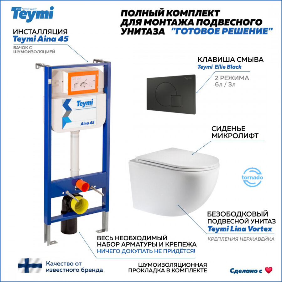 Готовое решение Teymi: Инсталляция Aina 45 + клавиша смыва Ellie черная + унитаз Lina Vortex F01403 информация: