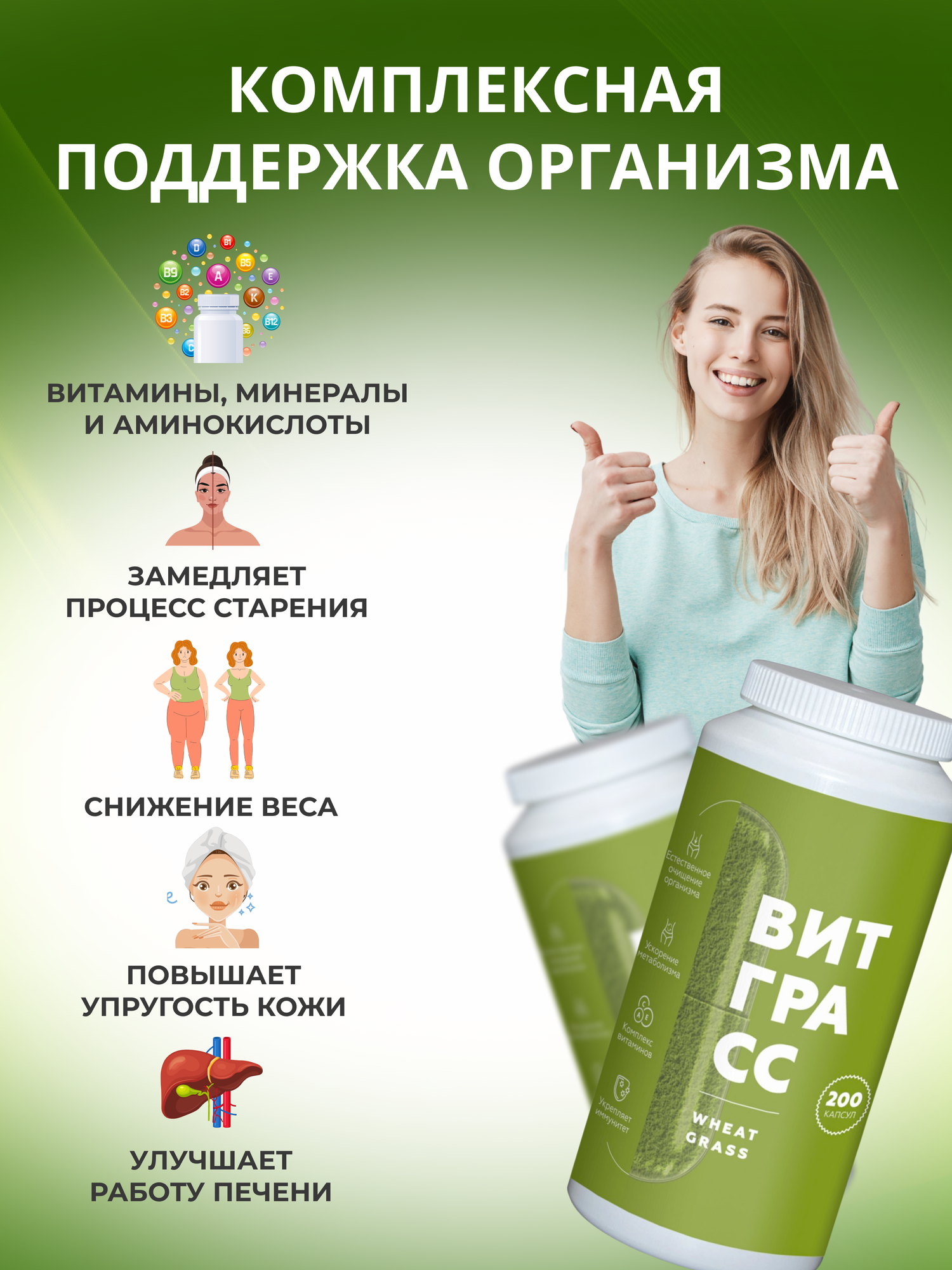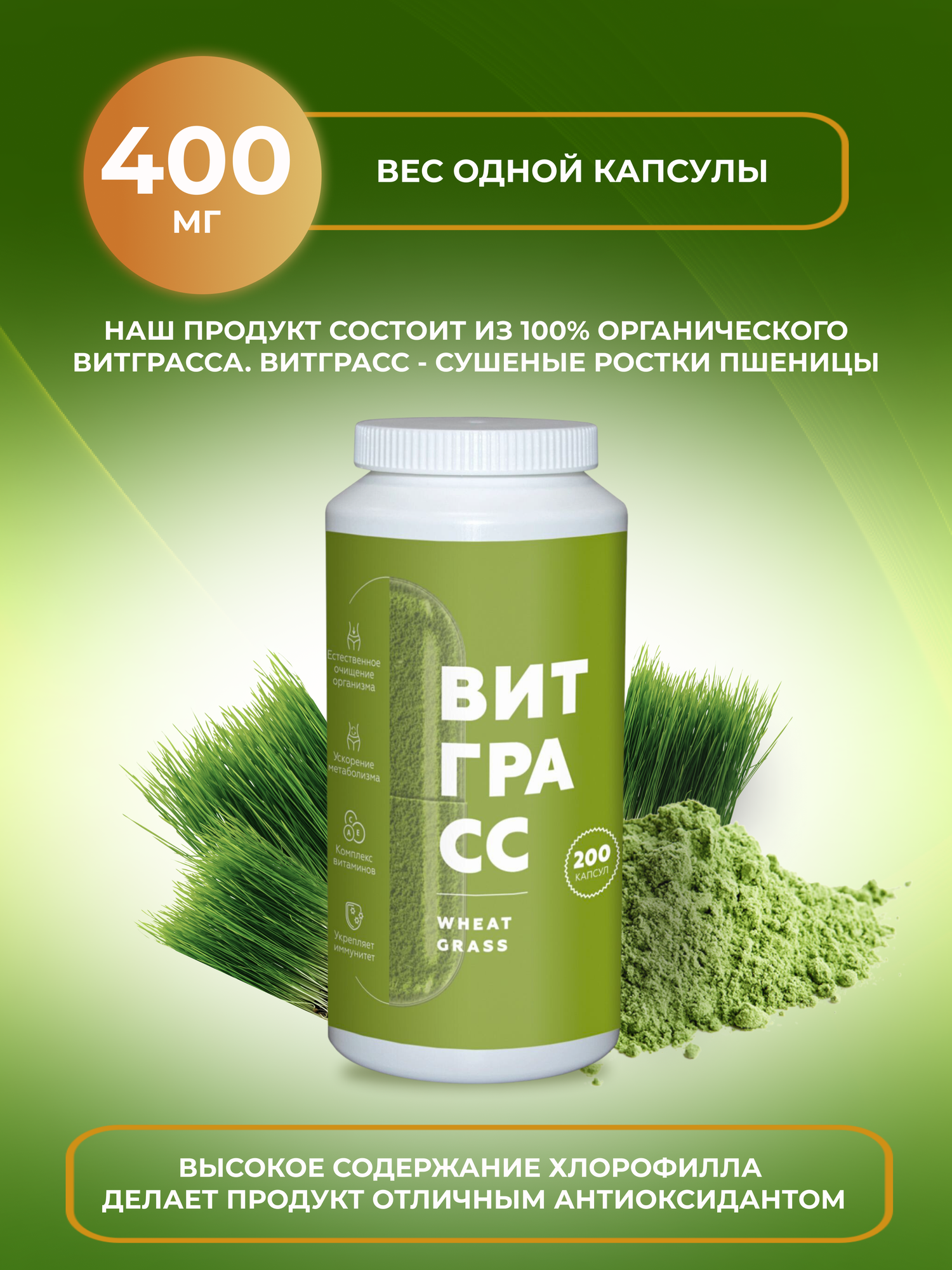 Витграсс порошок из ростков пшеницы в капсулах, суперфуд прессованные ростки пшеницы, 200 капсул информация: