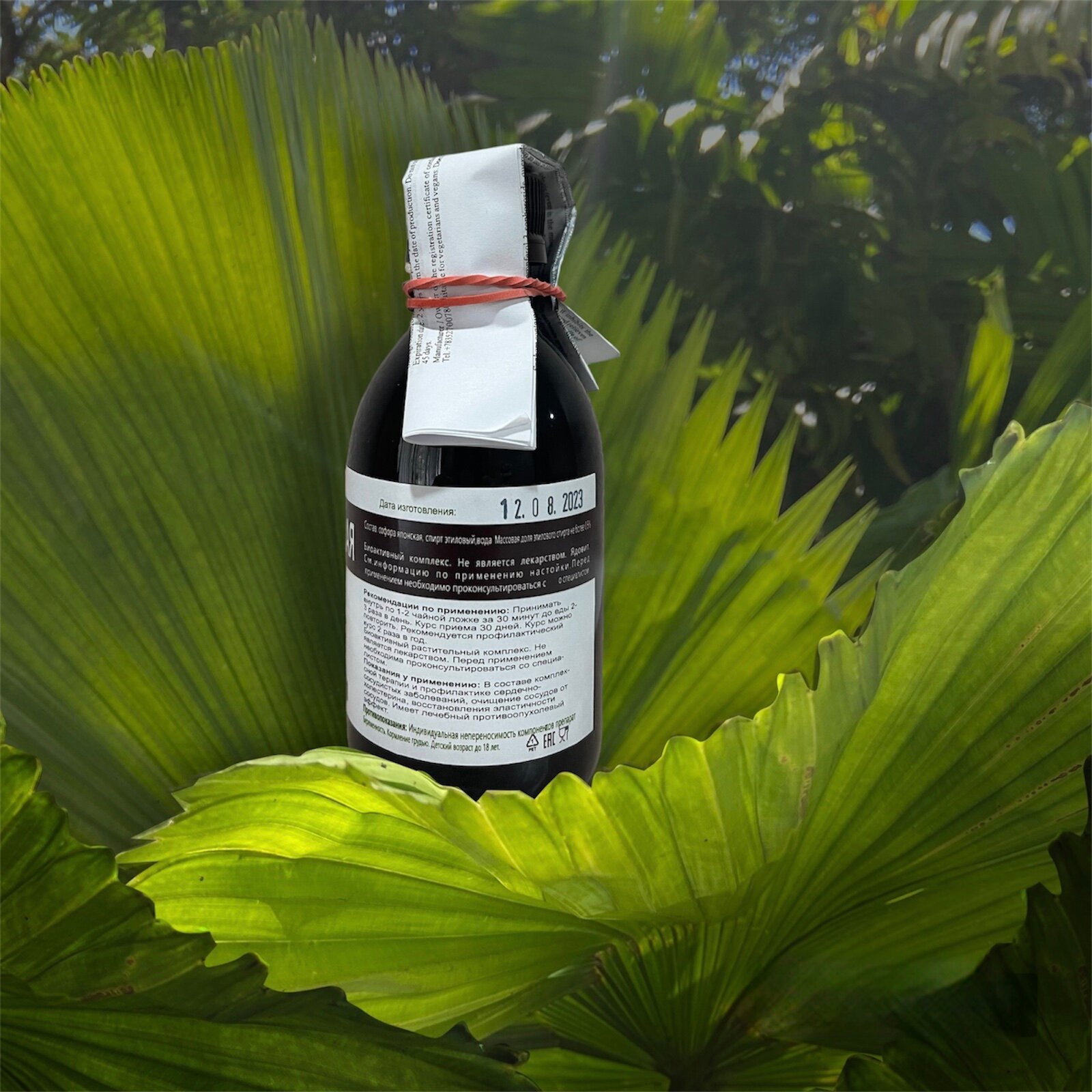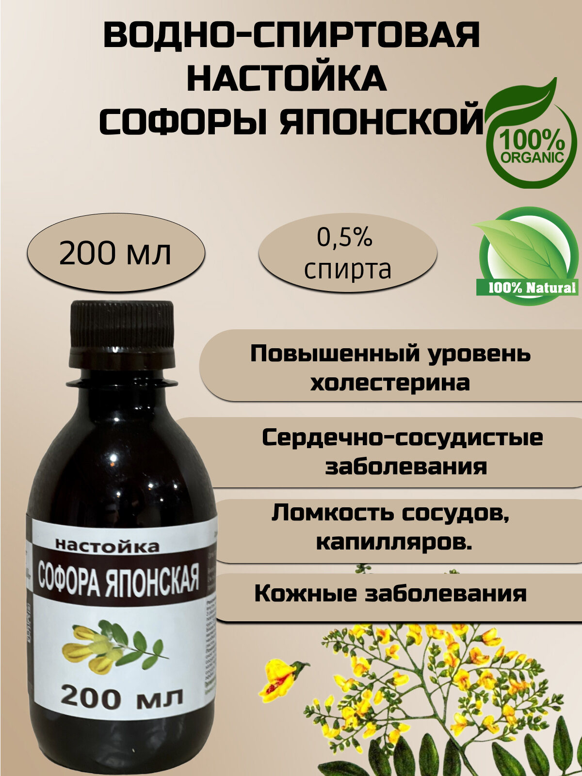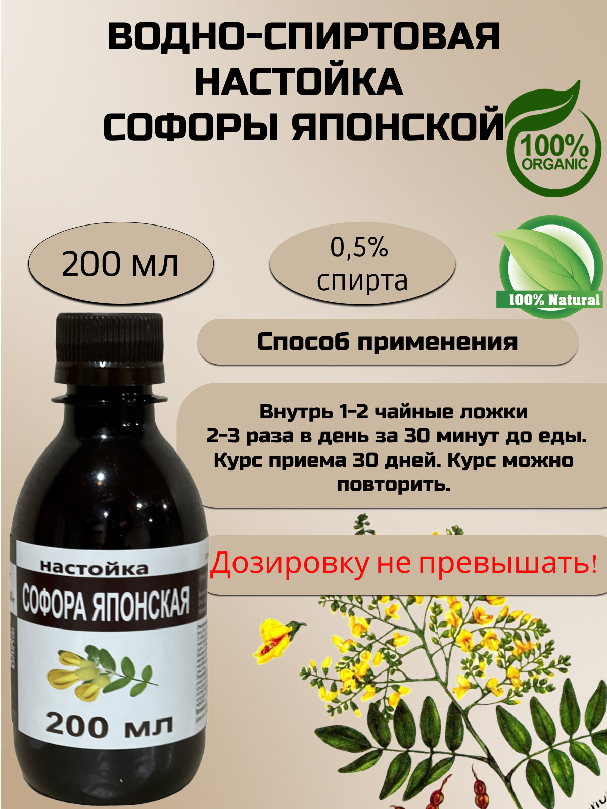 | Состав | Софора японская; — Спирт; — Вода. Массовая доля этилового спирта,%, не более 0,5. |