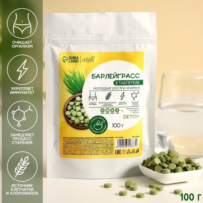 Барлейграсс в таблетках, молодые ростки ячменя, очищение организма, укрепление иммунитета, 100 г. информация:
