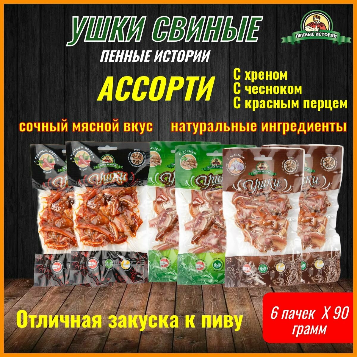 Ушки свиные к пиву "Пенные Истории" Ассорти 6 шт (Хрен, Чеснок, Красный перец) по 90 грамм информация: