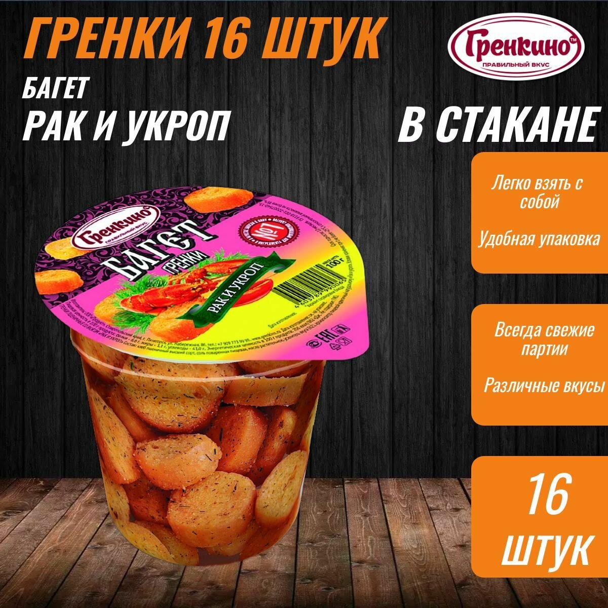 Стакан Гренки 16 штук по 100 грамм Сухарики багет снеки "Рак и Укроп" ТМ "гренкино" информация: