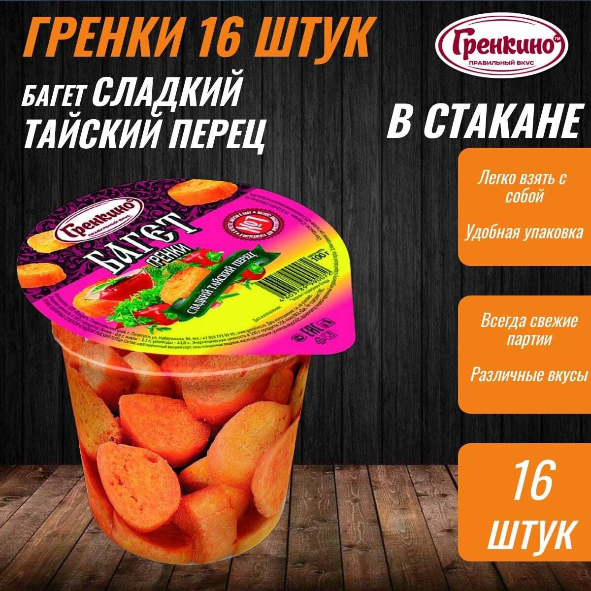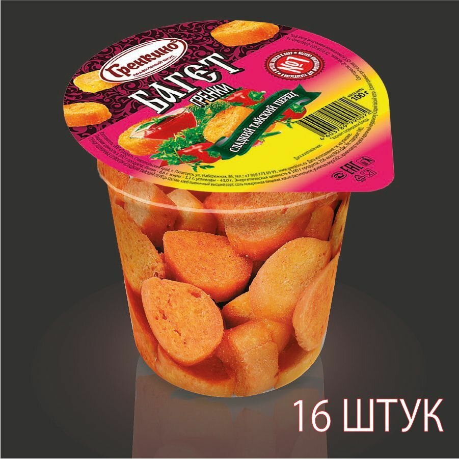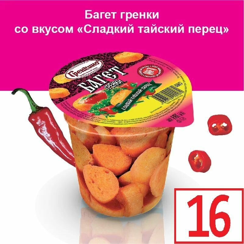 Стакан Гренки 16 штук по 100 грамм Сухарики багет снеки "Сладкий Тайский Перец" ТМ "гренкино" информация: