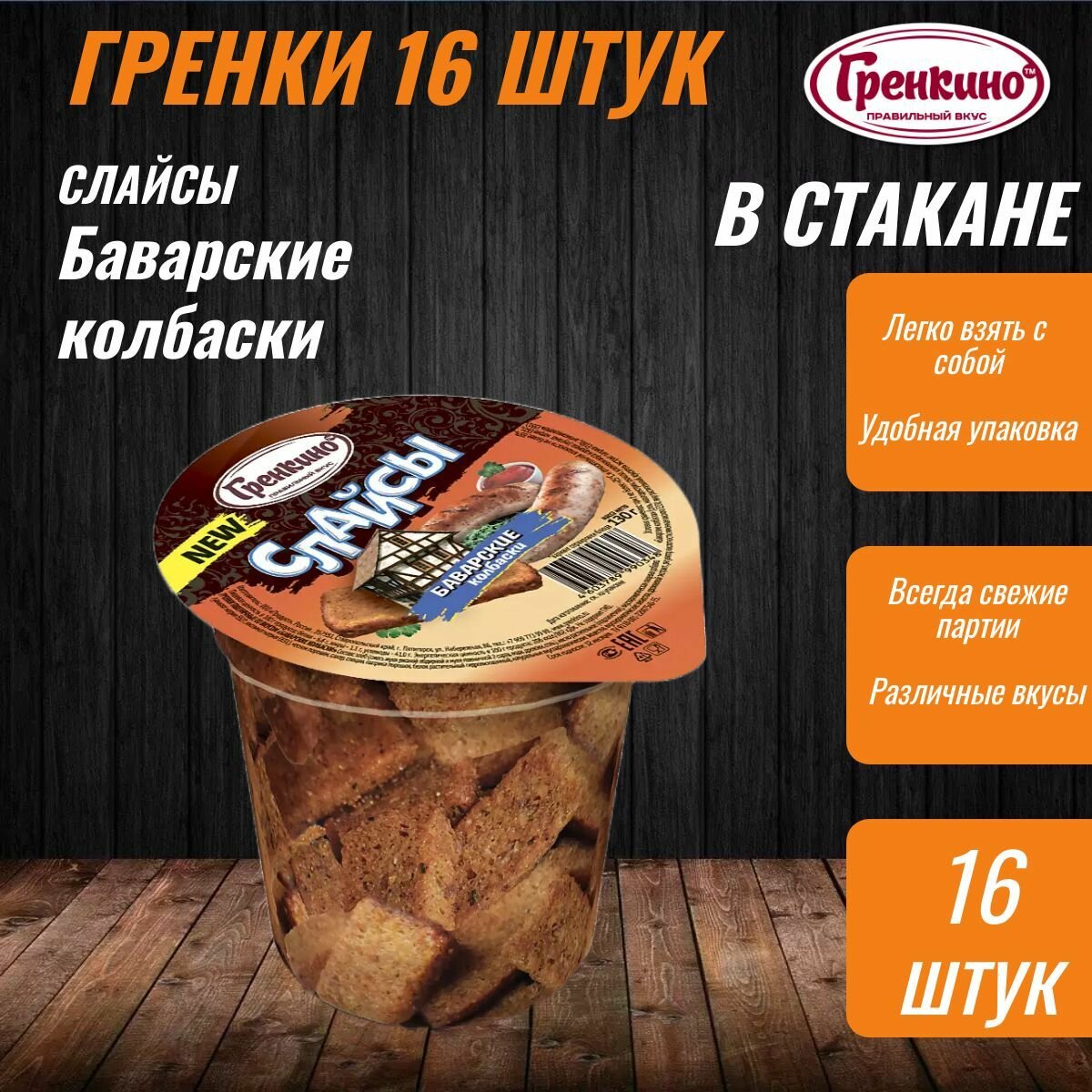 10 цен на Стакан Гренки 16 штук по 130 грамм Сухарики Слайс снеки "Баварские колбаски" ТМ "гренкино"
