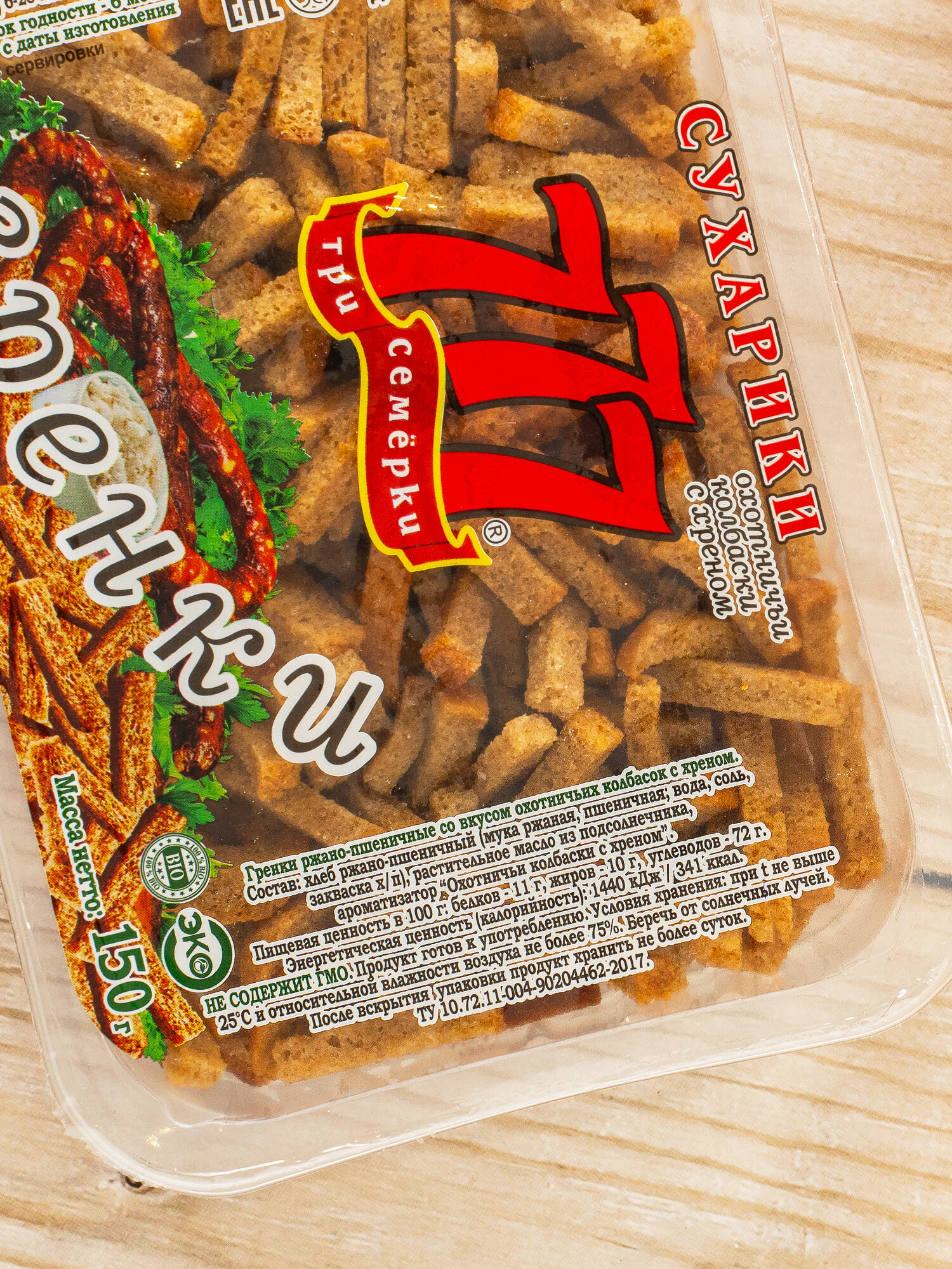 Отзывы на Сухарики гренки 777 со вкусом охотничьих колбасок (контейнер), 5 шт по 150 гр