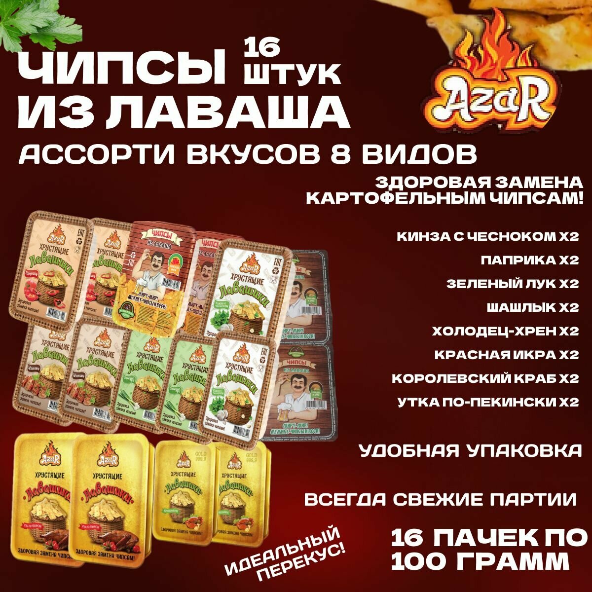 10 цен на Хрустящие лавашики ассорти 8 вкусов, чипсы из лаваша "AzaR" 16 шт по 100г.