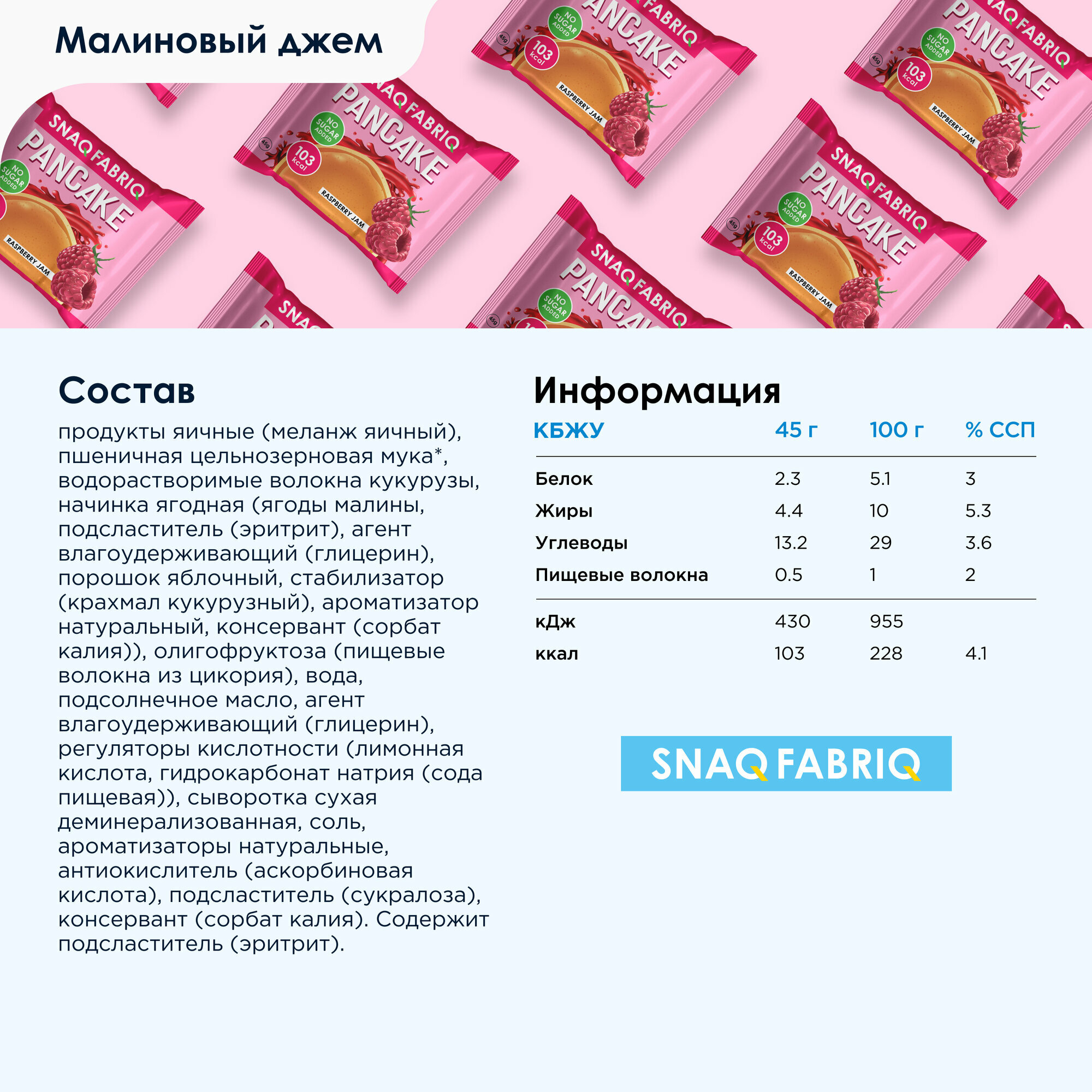 Панкейки с начинкой без сахара SNAQ FABRIQ "Малина - Джем", 10 шт х 45г информация: