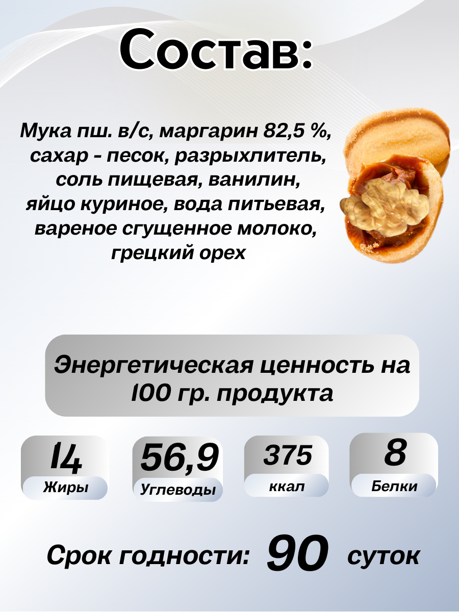 | Состав | сливочное масло 82%, мука пшеничная в/с , сахар-песок, разрыхлитель, соль пищевая, вода питьевая, ванилин, яйцо куриное, вареная сгущёнка, грецкий орех |