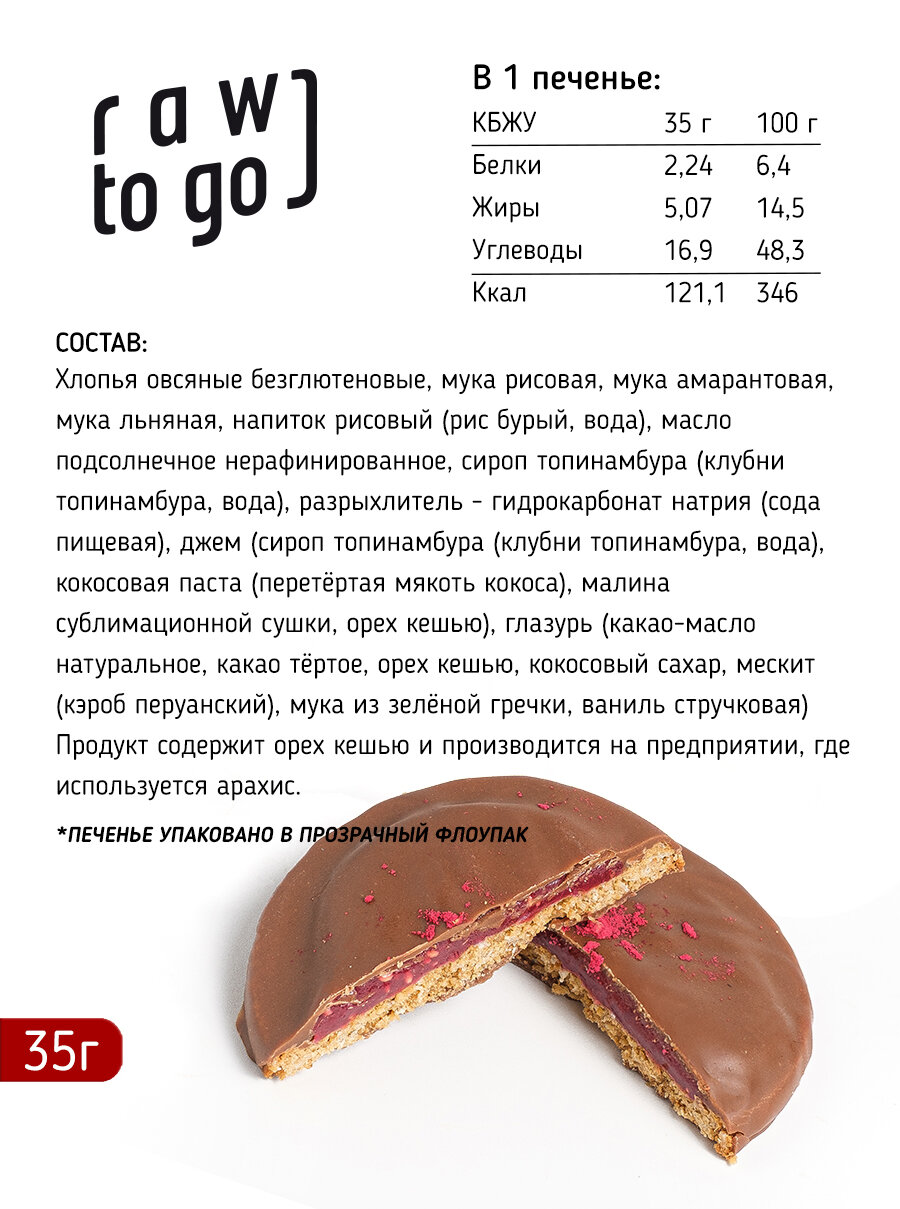 | Состав | печенье овсяное (хлопья овсяные, отруби овсяные, мука овсяная, масло подсолнечное нерафинированное, сироп финиковый (финики, вода питьевая)), какао-масло, сироп топинамбура, сироп цикория (инулин из корней цикория, вода), сахар кокосовый, орех кешью сырой, экстракт ячменно-солодовый (тёмный солод, вода, ячмень), кокосовая паста (перетертая мякоть кокоса), какао тёртое, мескит (кэроб перуанский), соль розовая гималайская, обжаренные зерна гречихи, экстракт ванили. Продукт содержит орех кешью и производится на предприятии, где используется арахис. |