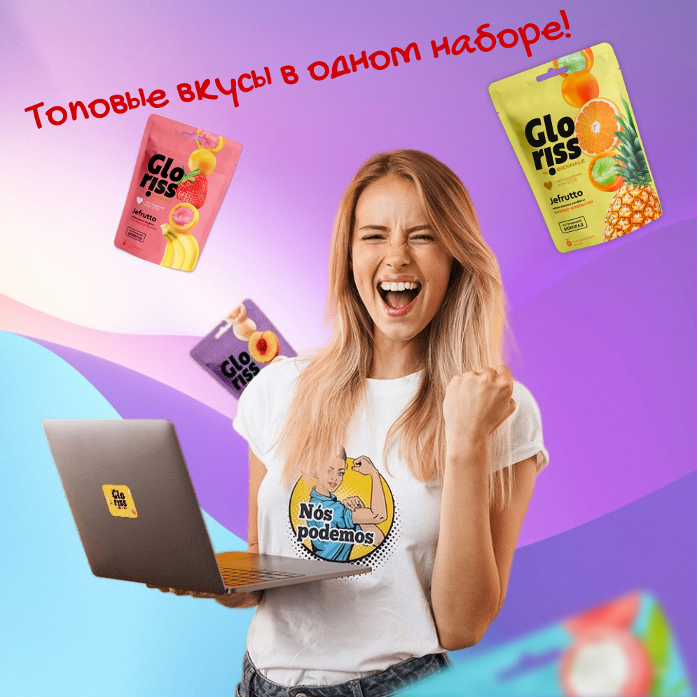 Набор ассорти жевательных конфет Gloriss: Ассорти, Освежающий арбуз, Манго-малина, Гуава-личи, 4 шт. по 75 г. 394 ₽