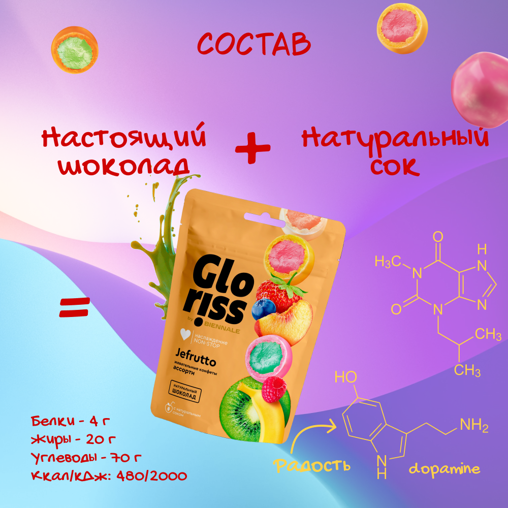Набор ассорти жевательных конфет Gloriss: Манго-малина 2 шт., Тутти-фрутти 2 шт., Ассорти 2 шт., Три шоколада 2 шт., 8 шт. по 35 г. 422 ₽
