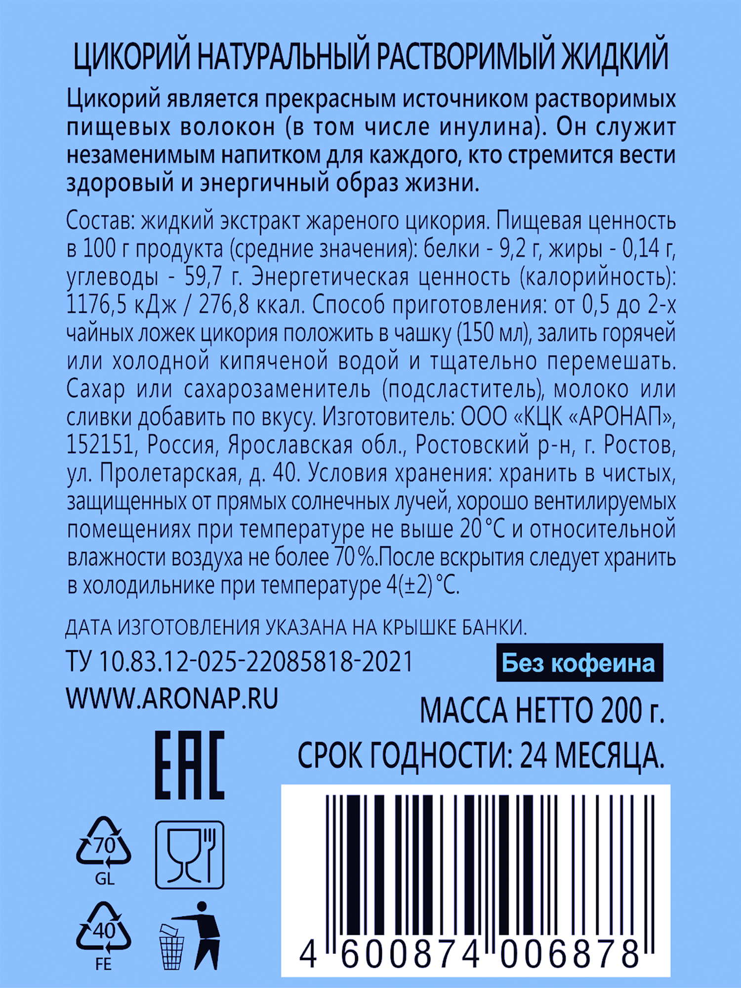 Цикорий жидкий экстракт растворимый А. П. Селиванов 100% натуральный без кофеина без сахара 200 г информация: