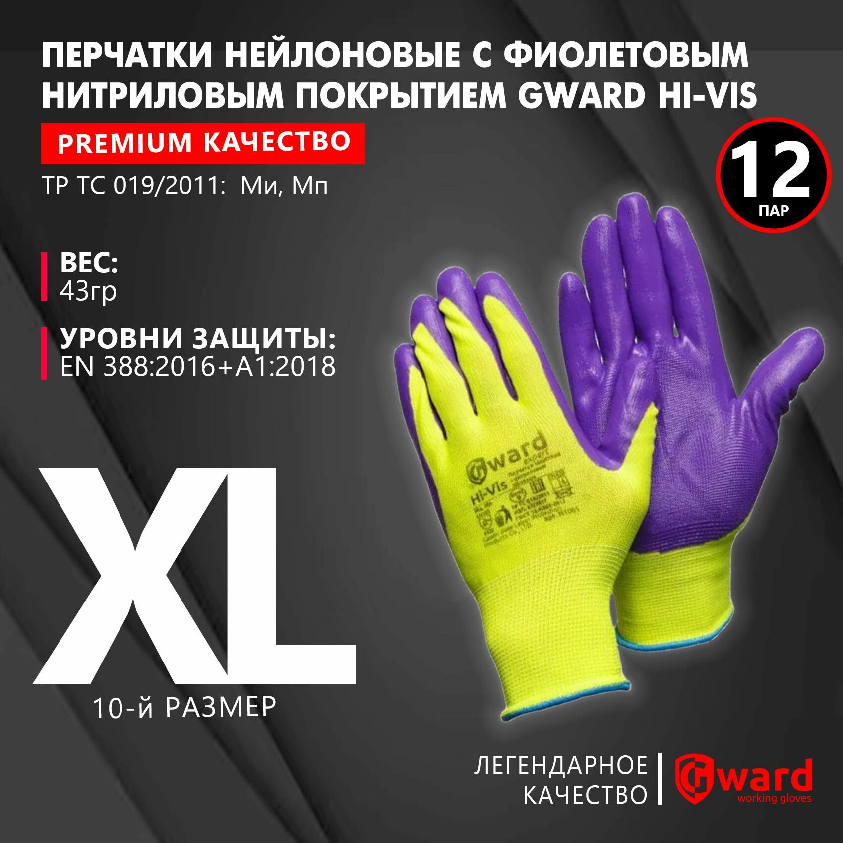 Перчатки нейлоновые с синим нитриловым покрытием Hi-Vis, рабочие, хозяйственные Gward Hi-Vis, размер 10 (XL), 12 пар информация:
