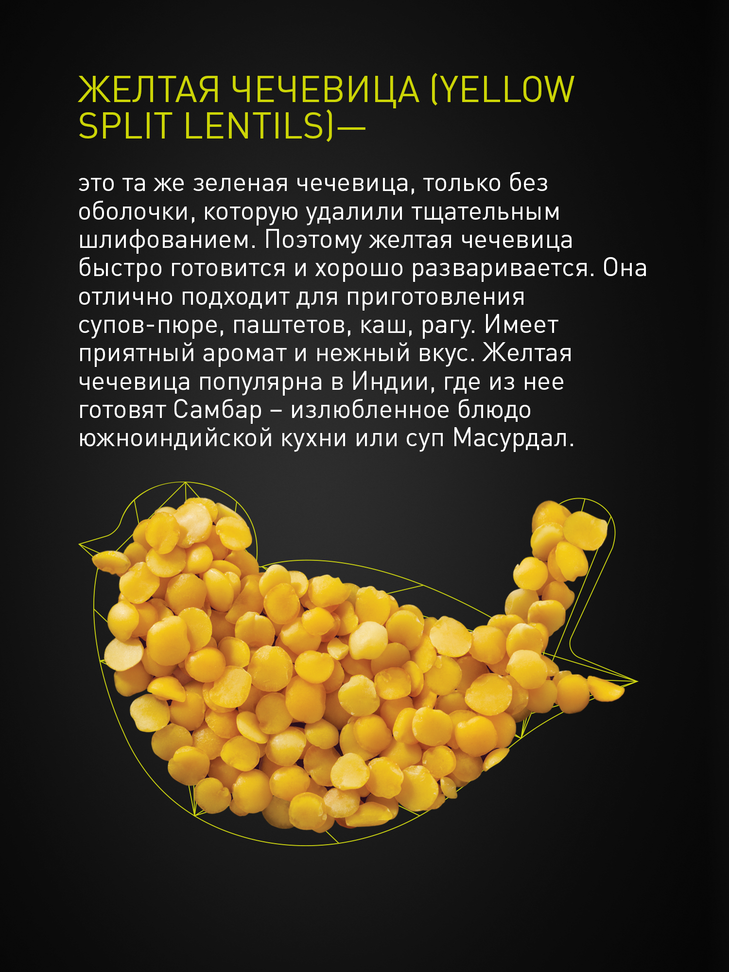 | Состав | чечевица желтая колотая. Может содержать следы глютена, сельдерея, сои, горчицы, арахиса, кунжута, орехов, молока и продуктов его переработки, яиц и продуктов их переработки. |
