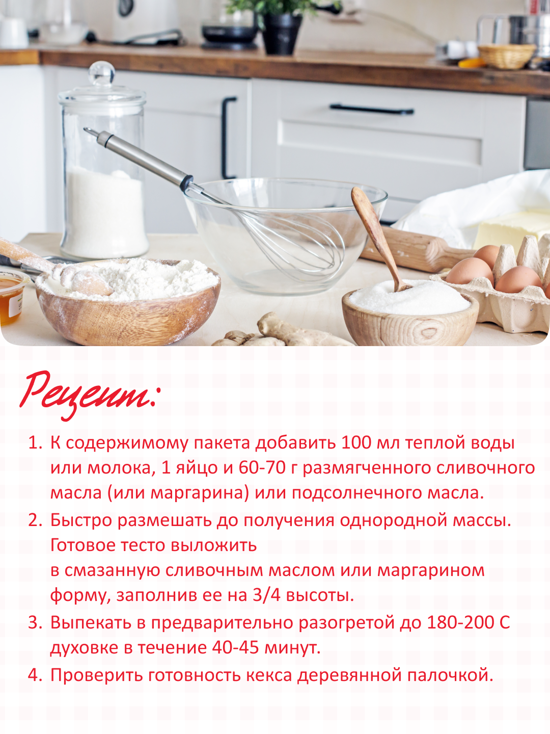 | Дополнительная информация | НЕОБХОДИМЫЕ ИНГРЕДИЕНТЫ: 60-70 г размягченного сливочного масла или маргарина, 1 яйцо, 100 мл теплой воды или молока. СПОСОБ ПРИГОТОВЛЕНИЯ: смешайте все ингредиенты до однородной массы. Выложите готовое тесто в смазанную маслом форму для кекса, заполнив ее на 3/4 высоты. Выпекайте в предварительно разогретой до 180-200 С духовке до готовности (35-45 минут). Проверьте готовность кекса деревянной палочкой. |