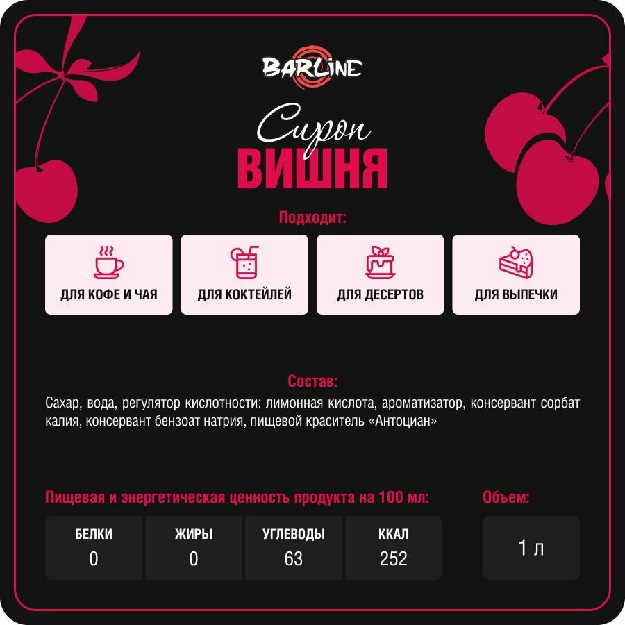 Сироп Barline Вишня (Cherry), 1 л, для кофе, чая, коктейлей и десертов, пластиковая бутылка, Барлайн информация: