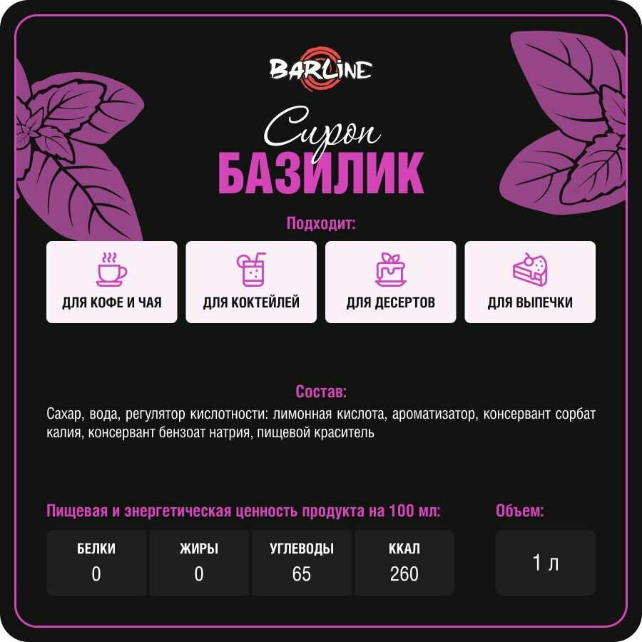 Сироп Barline Базилик (Basil), 1 л, для кофе, чая, коктейлей и десертов, пластиковая бутылка, Барлайн информация: