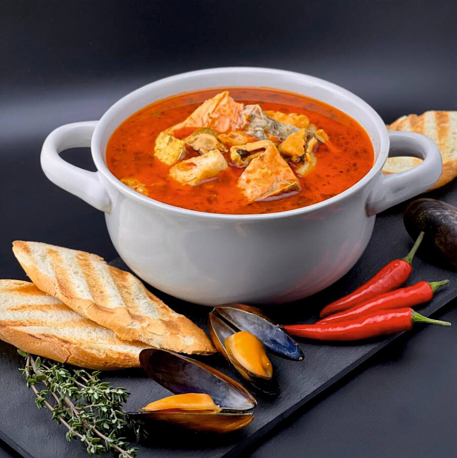 | Состав | форель, сиг, мидии, вино белое сухое, томаты, картофель, морковь, шафран, укроп, соль морская, тимьян, фенхель, лук-порей, петрушка, чеснок, лавровый лист, оливковое масло, перец чили, вода |