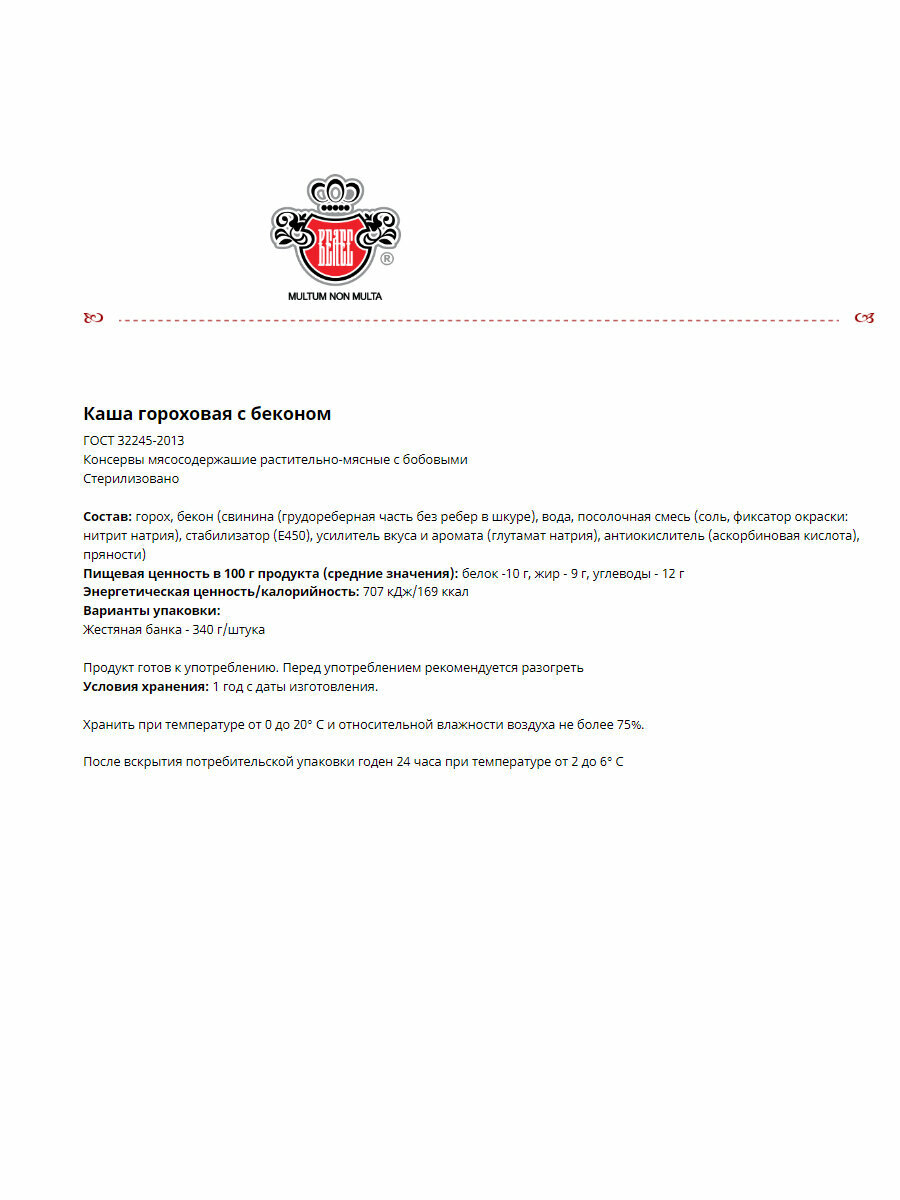 | Состав | горох, бекон (свинина (грудореберная часть без ребер в шкуре), вода, посолочная смесь |