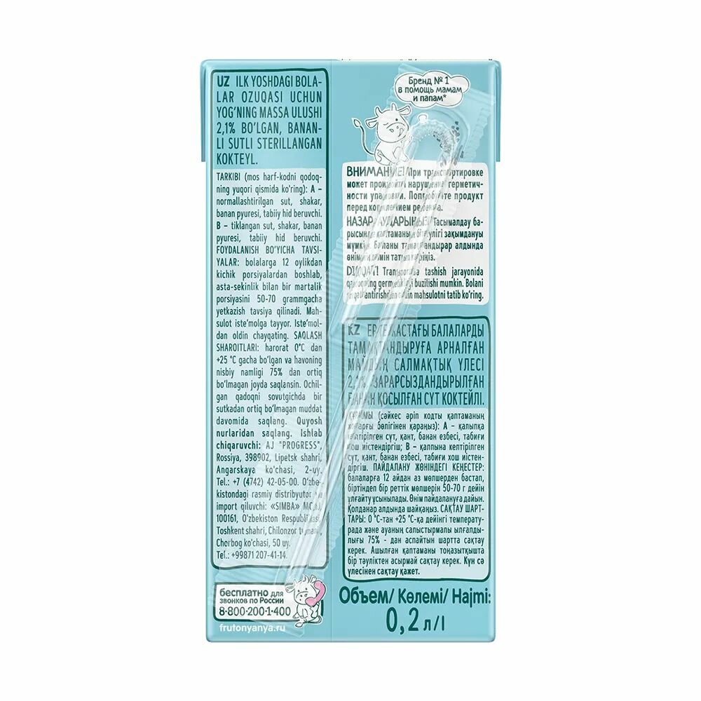 ФрутоНяня коктейль молочный банановый с 12 месяцев, 0,2 л, 12 шт информация:
