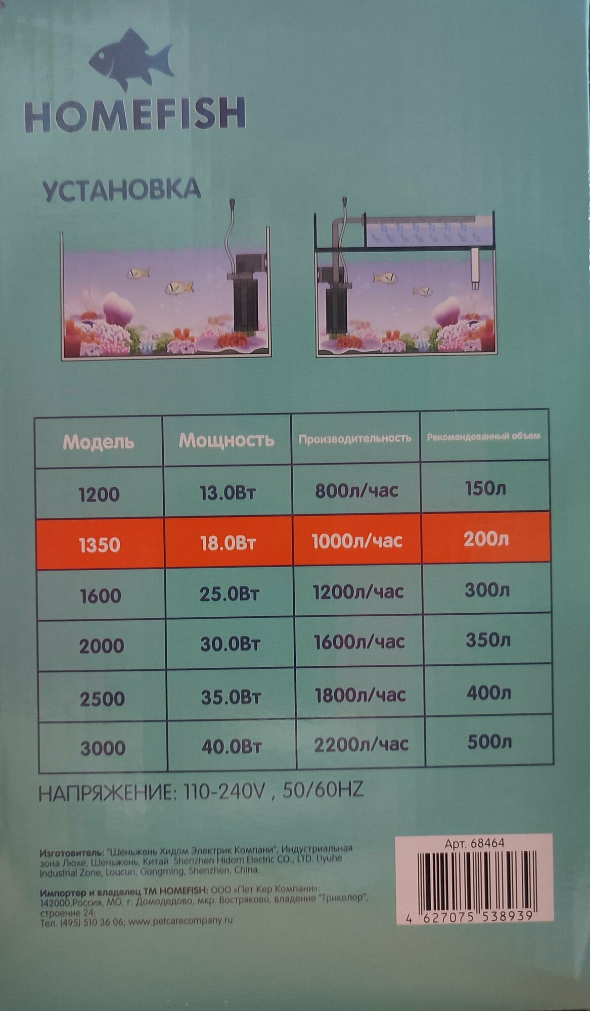 HOMEFISH до 200 л фильтр для аквариума 1350, шт информация: