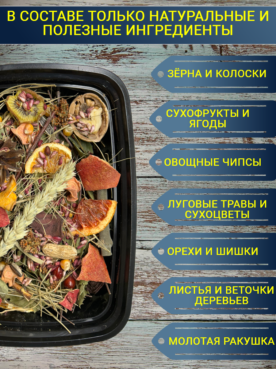 | Состав | Гранатовые косточки и гранатовые корочки, зероносмесь: пшеница, овес, просо красное, просо черное, кукуруза, чумиза,сафлор, колосок пшеницы, семена подсолнечника, семена тыквы, кедровые орехи, кедровые шишки, сосновые шишки, арахис, фундук, грецкий орех, шиповник, боярышник, рябина, облепиха, луговые травы, сухоцветы, ракушечник, сухофрукты: яблоки, апельсины, мандарины, помело, грейпфрут, киви,сушенные овощи:свекла, морковь, тыква, ветки деревьев, листва деревьев. |