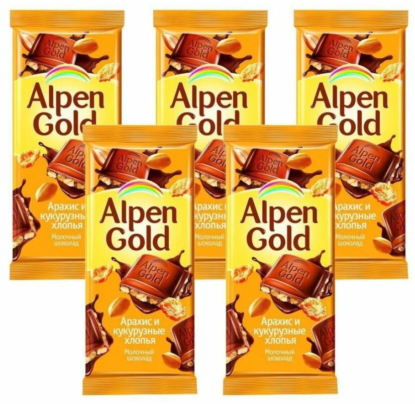 10 цен на ALPEN GOLD Молочный шоколад, Арахис, Кукурузные хлопья, 85 гр - 5 штук