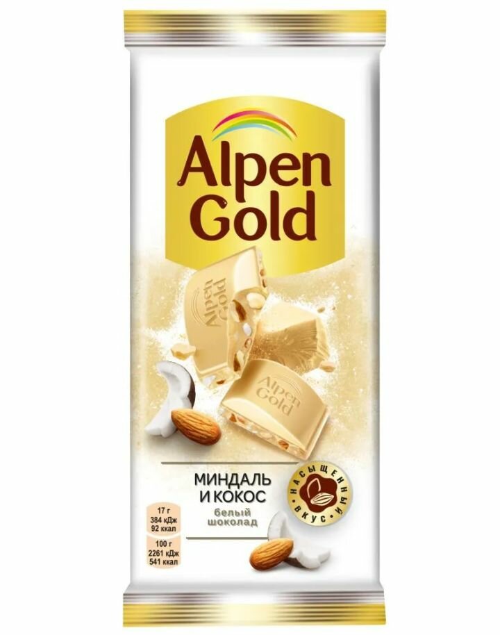 10 цен на ALPEN GOLD Белый шоколад, Миндаль, кокосовая стружка, 85 гр - 5 шт